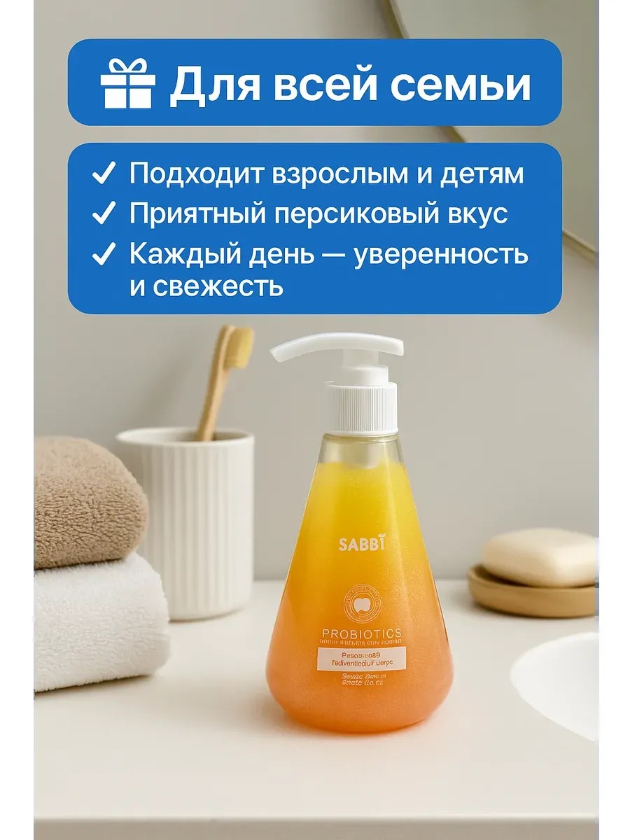 SABBI Whitening Gel Toothpaste with Probiotics (Peach Flavor, 220 ml) is an innovative product for gentle care of teeth and gums. Thanks to its unique formula with probiotics, the paste not only effectively whitens teeth but also cares for oral health, restores the balance of microflora and prevents unpleasant odor.