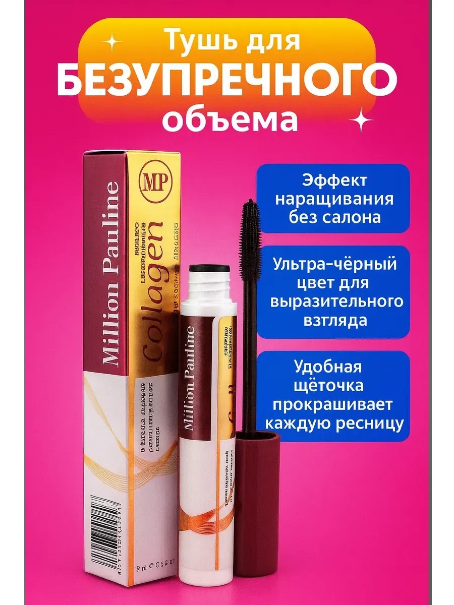 Million Pauline Collagen Mascara — тушь для ресниц с коллагеном для объёма, удлинения и ухода. Каждая девушка мечтает о выразительном взгляде и роскошных ресницах, которые подчеркнут естественную красоту глаз. Именно поэтому бренд Million Pauline разработал инновационную формулу туши Collagen Mascara, которая сочетает в себе декоративный эффект и уход за ресницами. Черная тушь для ресниц с коллагеном создана для того, чтобы дарить одновременно объём, удлинение и изгиб, а также укреплять ресницы по всей длине. Благодаря коллагену ресницы становятся более упругими, приобретают дополнительный блеск и естественную густоту. Эффект объёма — специальная текстура туши делает ресницы густыми и пышными, создавая эффект наращивания. Удлинение и изгиб — щёточка прокрашивает каждую ресничку от корней до кончиков, подчёркивая форму глаз. Уход и питание — коллаген укрепляет ресницы, делает их более эластичными и защищает от ломкости. Стойкость на весь день — тушь не осыпается, не оставляет следов и сохраняет свежий макияж даже к вечеру. Универсальность — идеально подходит для дневного и вечернего макияжа.Формула туши разработана так, чтобы ресницы выглядели аккуратно, без комков и с равномерным покрытием. Даже при нанесении нескольких слоёв тушь сохраняет лёгкость и естественность. Силиконовая щёточка для точного прокрашивания. Щёточка средней плотности позволяет прокрасить даже самые короткие ресницы, создавая идеально разделённый веер.