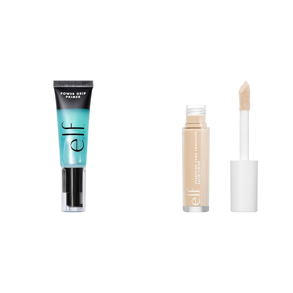 e.l.f. Cosmetics Power Grip Primer, Gel-Based Hydrating Face Primer For Smoothing Skin Gripping Makeup, Moisturizes Primes, Clear, 0.811 Fl Oz (24 mL) Your makeup isn't going anywhere. e.l.f. Cosmetics Power Grip face primer grabs hold of your makeup all day long, while giving skin a soft-focus effect for a smooth complexion. The formula is enriched with beneficial ingredient Hyaluronic Acid to moisturize, prep, and give skin a soft-focus, improving the look and feel of your skin. The gel-based primer goes on clear, making it the ideal makeup application base for all skin types and skin tones. e.l.f. Hydrating Camo Concealer, Satin Finish, Conceals, Corrects Highlights, Light Ivory, 0.203 Fl Oz (6mL) Camouflage those pesky spots and under-eye circles with this high-coverage, hydrating and longwearing concealer.Product 2: NO MORE UNDER-EYE CIRCLES: This nourishing product covers up imperfections and under-eye circles while delivering a boost of hydration to your skin. Product 2: CREASE PROOF COVERAGE: The e.l.f. Hydrating Camo Concealer is long-wear liquid concealer that provides crease-proof full coverage while hydrating your skin. The shade Light Ivory is light with a neutral warm undertone. Product 1: HOW TO USE: Apply evenly to face before makeup using your fingertips to pat into skin. The warmth of your fingers will help the product melt into skin for even application. Allow 30 seconds to set before applying makeup. Stop use if irritation. Product 1: MOISTURIZES WHILE PRIMING: Infused with powerhouse ingredients like Hyaluronic Acid to retain moisture for a plump complexion, this makeup primer moisturizes, preps, and smoothes to perfection, improving the look and feel of your skin. Product 1: FOR ALL SKIN TYPES: Our Power Grip Primer's formula goes on clear with a translucent finish for all skin types and skin tones. It is also non-comedogenic (does not clog pores!). Product 1: SKIN-SMOOTHING GRIPPING PRIMER: Your makeup. It's not going anywhere. Prep skin with this gel-based face primer that has the power to grip your makeup while giving skin a natural finish for a smoother complexion.