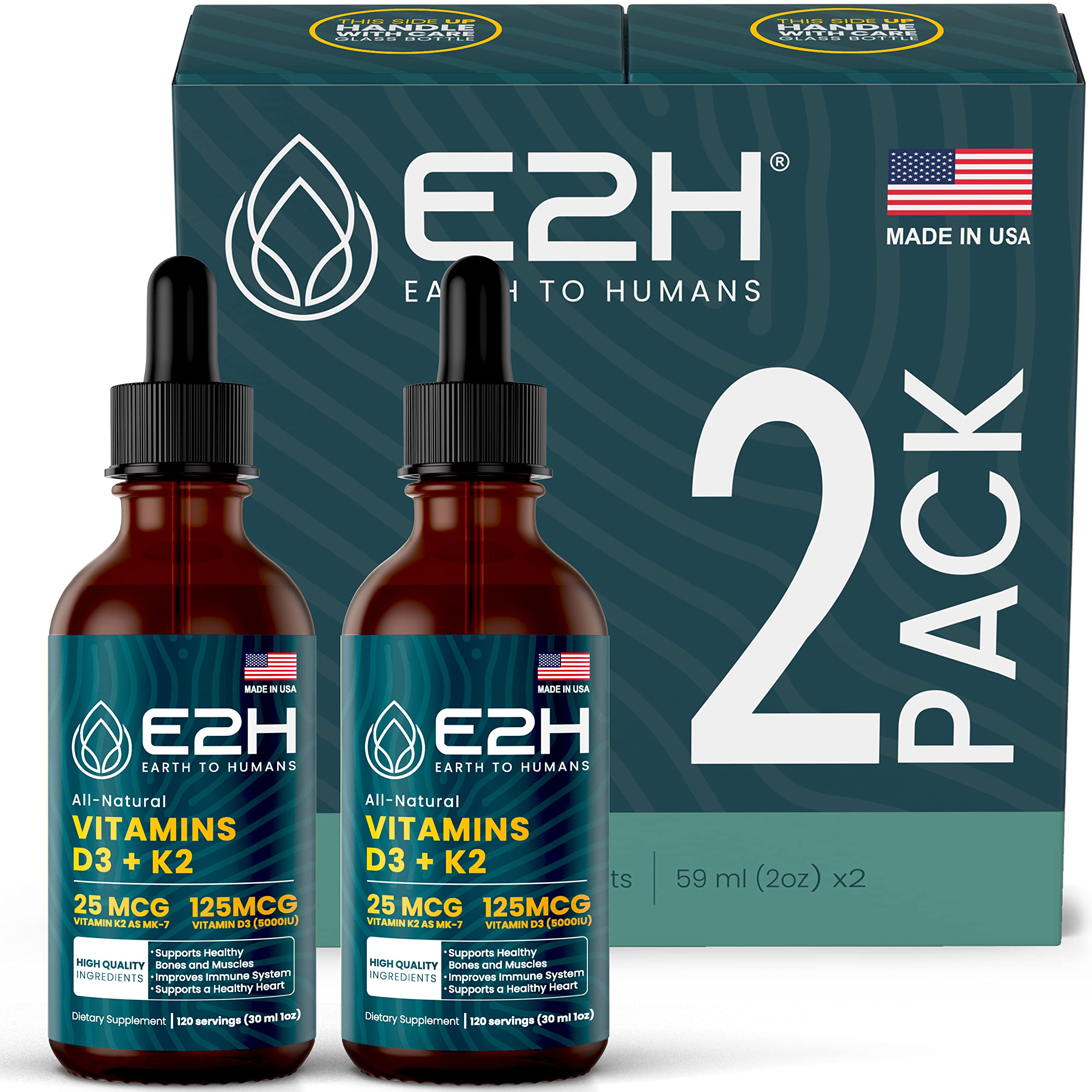 E2H EARTH TO HUMANS Vitamin D3 & K2 Supplement for Immune Support - Liquid Vitamin D3 5000 IU - Made in The USA | Non-GMO Vegan - (2 Bottles) 1 Fl Oz (Pack of 2)