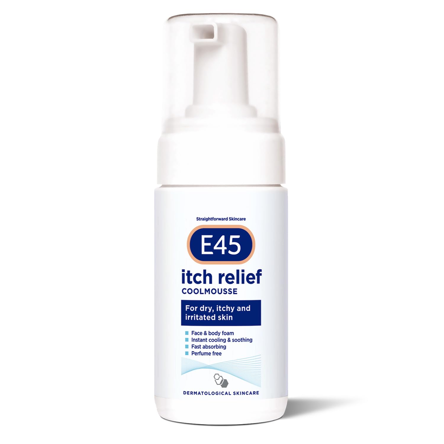 : Dual Action E45 Itch Relief Coolmousse instantly cools and soothes dry, itchy, and irritated skin. Formulated with betaine, a natural osmoprotectant with moisturizing and soothing properties, and highly purified aloe vera leaf extract to soothe and hydrate. Its light mousse texture absorbs quickly and is easily absorbed without leaving a sticky residue for immediate, soothing relief. How to Use: E45 Itch Relief Coolmousse is fragrance-free and suitable for dry, irritated, and itchy skin. It is suitable for use on the body, face, and hands and is safe for the whole family. Simply shake the can a few times before use, squeeze the mousse into your palm, and gently apply to the affected area without rubbing. Use as often as needed. For extra cooling relief, store in the refrigerator. Quality Daily Skincare. For 60 years, E45 has excelled in treating dry, itchy skin and skin conditions such as eczema, psoriasis, ichthyosis, and more. We understand the importance of quality products for everyday use, simplifying skincare. The E45 range, suitable for different skin types and body areas, aims to protect and maintain healthy skin. Proven dermatological expertise for dry and sensitive skin. History: In 1952, our E45 cream was launched in response to customer demand for a soothing and protective skin product. In 1963, doctors recognized the benefits of E45 cream on dry skin, and it became available in pharmacies and retail stores in 1980. We continue to develop products with patients in mind. We are committed to meeting the needs of patients and healthcare professionals by developing improved treatments for their skincare routines. Ingredients Ectoin, Aqua, Hydrogenated Lecithin, Ceramide-3, Squalane, Olea Europea Fruit Oil, Caprylic Capric Triglyceride, Butyrospermum Parkii Butter, Oryza Sativa (Rice) Bran Cera, Carbomer, Xanthan Gum, Sodium Carbomer, Cardiospermum Halicacabum Flower Leaf Vine Extract, Glycine, Alanine, Pentylene Glycol, Butylene Glycol, Hydroxyethylcellulose, Glycerin, Hydroxyphenyl Propamidobenzoic Acid Safety Warning Do not use on infected skin. For external use only. Keep out of reach of children. If a reaction occurs, discontinue use immediately. If symptoms persist or worsen, consult a doctor. For best before date, see Carton Base. Do not smoke or use near open flames – risk of serious burns. Fabric (clothing, bedding, salad dressing, etc.) that has come into contact with this product burns more easily and is a serious fire hazard. See more