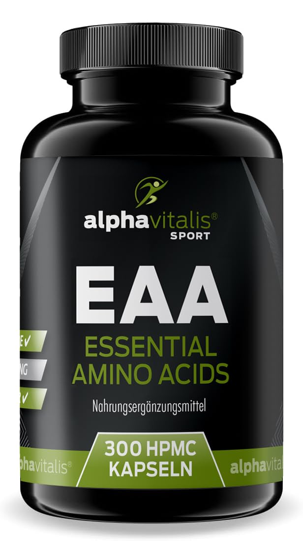 ✓ä- All Alphavitalis Sport Dietary supplements are produced exclusively in Germany and are subject to strict quality and hygiene standards.You also benefit from our many years of experience in the fitness and supplement area.✓ - The essential amino acid capsules are produced by the fermentation of corn, which means that they are completely vegan and are suitable for both vegans and vegetarians.We recommend taking 1 serving (5 capsules) with plenty of liquid twice a day.✓ä- Our high -dose EAA capsule is gluten -free, sugar -free, fat -free and lactose -free and does not contain any unnecessary additives, fillers, genetic engineering, magnesium stearate, sweeteners or gelatin.Perfect complement together with creatine monohydrate and L-glutamine.✓ä-The Premium EAA capsules contain all essential amino acids and BCAAs in high-dose form-L-Leucin, L-Isoleucin, L-Valin, L-Lysine, L-threonine, L-methionine, L-phenylalanine and L-tryptophan, including the BCAA L-Leucin, L-Isoleucin and L-Valin.✓ä- EAA are currently the most popular nutritional supplements in the fitness scene and have even replaced BCAA.They optimally complement protein powder because they have to be absorbed through food or nutritional supplements.✓Ä- Alle alphavitalis SPORT Nahrungsergänzungsmittel werden ausschließlich in Deutschland produziert und unterliegen strengen Qualitäts- und Hygienestandards. Profitiere auch du von unserer langjährigen Erfahrung im Fitness und Supplement Bereich. ✓ - Die essentiellen Aminosäuren Kapseln werden durch die Fermentation von Mais hergestellt, wodurch sie vollständig vegan sind und sowohl für Veganer als auch Vegetarier geeignet sind. Wir empfehlen, 2x täglich 1 Portion (5 Kapseln) mit reichlich Flüssigkeit einzunehmen. ✓Ä- Unsere hochdosierte EAA Kapsel ist glutenfrei, zuckerfrei, fettfrei sowie laktosefrei enthält keine überflüssigen Zusatzstoffe, Füllstoffe, Gentechnik, Magnesiumstearat, Süßstoffe oder Gelatine. Perfekte Ergänzung zusammen mit Creatin Monohydrat und L-Glutamin. ✓Ä- Die Premium EAA Kapseln enthalten alle essentiellen Aminosäuren und BCAAs in hochdosierter Form - L-Leucin, L-Isoleucin, L-Valin, L-Lysin, L-Threonin, L-Methionin, L-Phenylalanin und L-Tryptophan, somit inkl. der BCAA L-Leucin, L-Isoleucin und L-Valin. ✓Ä- EAA sind derzeit die beliebtesten Nahrungsergänzungsmittel in der Fitness-Szene und haben sogar BCAA abgelöst. Sie ergänzen Protein-Pulver optimal, da sie über die Nahrung oder Nahrungsergänzungsmittel aufgenommen werden müssen.EAA Kapseln hochdosiert 300 Stk. - vegan - mit allen 8 essentiellen Aminosäuren hochdosiert inkl. BCAA - EAA Kapseln ohne Magnesiumstearat - essentielle Aminosäuren hochdosiert - EAA Kapseln vegan 300 vegane Kapseln
