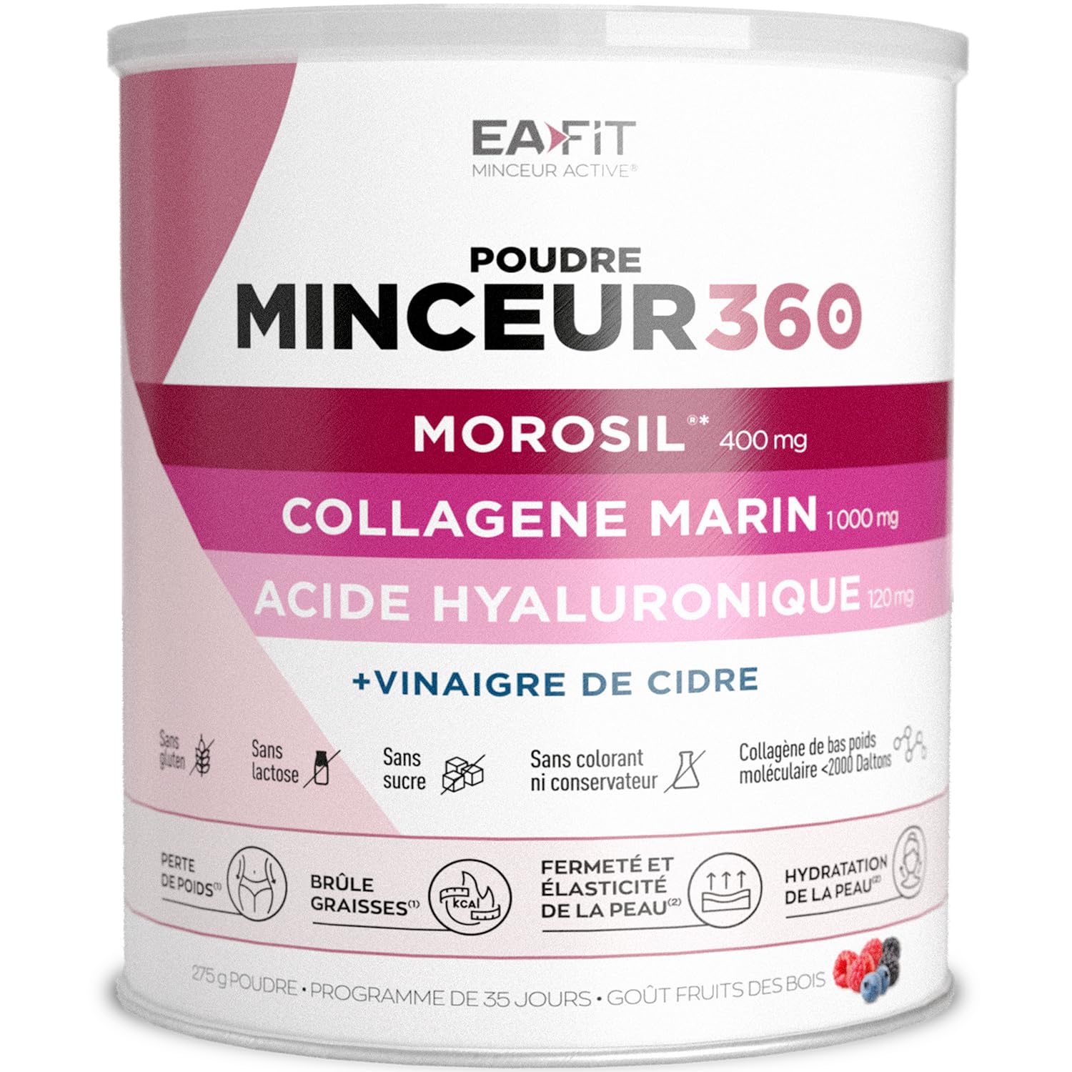 Over time, the natural production of collagen and hyaluronic acid decreases with age. Taking care of your skin and body is essential to maintaining a healthy lifestyle through a balanced diet and a complete weight loss program. EAFIT Minceur has developed a unique Slimming Beauty formula combining collagen, hyaluronic acid and Morosil , 3 most sought-after trendy active ingredients for the beauty of the skin and for a complete slimming program. - Morosil comes from Moro Orange from Sicily. This active ingredient contains anthocyanin pigments. Morosil has been the subject of two scientific studies demonstrating improved benefits for the figure. - Collagen, naturally present in the body, this protein is recognized for the firmness, elasticity and hydration of the skin. - Hyaluronic acid, naturally present in the body, this active ingredient is known for hydration and elasticity of the skin. - Apple cider vinegar, traditionally recognized and used for its benefits on well-being and digestion. The formula is completed by Cola Nut which helps burn fat and support slimming and weight loss programs." INGREDIENTS Bulking agents: maltodextrin - isomalt, hydrolyzed collagen (FISH), sweet orange extract (Citrus sinensis), sodium hyaluronic acid, forest fruit flavor, apple cider vinegar, sweetener: sucralose, kola nut extract (Cola nitida) DIRECTIONS FOR USE "In a large glass of water (200 ml), dissolve 2 measuring spoons (10 g) for the first 20 days and 1 measuring spoon (5 g) for the following 15 days. Program to be repeated if necessary. Store at a stable, moderate temperature and away from humidity. This pot allows you to make 27 daily portions of 10 g." SAFETY WARNING "Food supplements should be used as part of a healthy lifestyle and not be used as a substitute for a varied and balanced diet. Keep out of the reach of young children. Do not exceed the recommended daily dose. Excessive consumption may have laxative effects" MADE IN FRANCE Minceur 360 powder is an ally for burning fat and losing weight while hydrating the skin. With a delicious red fruit flavor. Gluten-free, lactose-free, sugar-free, and free of colorings and preservatives. EAFIT, a leading French brand in sports nutrition since 1991. HYALURONIC ACID At 120mg, our hyaluronic acid is naturally present in the body. This active ingredient offers hydrating and plumping benefits, promoting nourished, smoother, and younger-looking skin. LOW MOLECULAR WEIGHT MARINE COLLAGEN Our marine collagen has a molecular weight 2000 daltons and is highly assimilable by the body. Naturally present in the body, this protein contributes to the firmness, elasticity, and hydration of the skin. It has anti-wrinkle, anti-aging, and anti-acne effects. MOROSIL Morosil is an active ingredient derived from the Moro Orange native to Sicily, Italy. This active ingredient contains anthocyanin pigments. Morosil has been the subject of two scientific studies demonstrating improved benefits for the figure. These studies demonstrate that MOROSIL has effects on weight loss, fat mass reduction or other aspects related to body composition. MOROSIL AND APPLE CIDER VINEGAR WEIGHT LOSS A unique Slimming and Beauty formula combining marine collagen, hyaluronic acid and Morosil, 3 trendy and effective active ingredients most sought after for the beauty of the skin and for a complete slimming program. Add to this apple cider vinegar known for its benefits for optimal digestion. Au fil du temps, la production naturelle du collagène et de l'acide hyaluronique diminue avec l'âge. Prendre soin de sa peau et de son corps est essentiel pour maintenir un mode de vie sain grâce à un régime alimentaire équilibré et un programme minceur complet. EAFIT Minceur a développé une formule unique Minceur Beauté associant le collagène, l'acide hyaluronique et le Morosil , 3 actifs tendance les plus recherchés pour la beauté de la peau et pour un programme minceur complet. - Le Morosil, est issu de l'Orange Moro originaire de Sicile. Cet actif contient des pigments anthocyanes. Le Morosil a fait l'objet de deux études scientifiques démontrant une amélioration des bénéfices sur la silhouette. - Le collagène, naturellement présent dans le corps, cette protéine est reconnue pour la fermeté, l'élasticité et l'hydratation de la peau. - L'acide hyaluronique, naturellement présent dans le corps, cet actif est reconnu pour l'hydratation et l'élasticité de la peau. - Le vinaigre de cidre de pomme, traditionellement reconnu et utilisé pour ses bienfaits sur le bien-être et la digestion. La formule est complétée par la noix de Cola qui aide à brûler les graisses et à soutenir la minceur et les programmes de perte de poids." INGRÉDIENTS Agents de charge : maltodextrine - isomalt, collagène hydrolysé (POISSON), extrait d'oranger doux (Citrus sinensis), acide hyaluronique de sodium, arôme fruits des bois, vinaigre de cidre de pomme, édulcorant : sucralose, extrait de noix de kola (Cola nitida) MODE D'EMPLOI "Dans un grand verre d'eau (200 ml) dissoudre 2 cuillères doseuses (10 g) les 20 premiers jours et 1 cuillère doseuse (5 g) les 15 jours suivants. Programme à renouveler si nécessaire. À conserver à une température stable et modérée et à l'abri de l'humidité. Ce pot permet de réaliser 27 portions journalière de 10 g." AVERTISSEMENT DE SÛRETÉ "Les compléments alimentaires doivent être utilisés dans le cadre d'un mode de vie sain et ne pas être utilisés comme substituts d'un régime alimentaire varié et équilibré. À tenir hors de la portée des jeunes enfants. Ne pas dépasser la dose journalière recommandée. Une consommation excessive peut avoir des effets laxatifs" FABRIQUE EN FRANCE Minceur 360 poudre est un allié pour brûler les graisses et perdre du poids tout en hydratant la peau. Au bon goût fruits rouges. Sans gluten sans lactose sans sucre sans colorant ni conservateur. EAFIT marque française leader en nutrition sportive depuis 1
