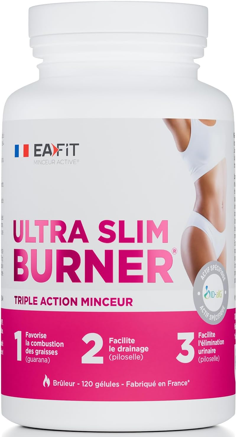 Discover our food supplement specially designed to promote your well-being and help you achieve your weight loss goals. Thanks to its unique formula, this product will allow you to effectively fight against water retention, thus facilitating weight loss and drainage and contributing to your general well-being. In addition to a balanced diet and regular physical activity, this food supplement will help you regain a sculpted and toned body. INGREDIENTS Bulking agent: maltodextrins, ID-alG™ (brown algae and grape extracts), green tea extract (maltodexrins), guarana extract (maltodextrins), pilosella extract (maltodextrins, silica), caffeine. Anti-caking agent: magnesium stearate, vitamin B6. Mineral: chromium chloride. Capsule: marine gelatin. DIRECTIONS FOR USE 2 capsules with breakfast and 2 capsules with lunch with a large glass of water. 30 day program. Can be renewed as often as necessary to prolong the active slimming action all year round. Food Supplement Available in 120 capsules. Lifespan 3 years LABORATOIRE DES GRANIONS - French brand expert in oligotherapy and natural health since 1948, sold in pharmacies and drugstores, Complete range of food supplements. WELL-BEING - The Ultra Slim Burner capsule from EAFIT MINCEUR combines proven results with a pleasant experience thanks to its delicious fruity flavor, Enjoy the benefits of a high-quality fat burner to boost your metabolism and achieve a slimmer figure. EAFIT MINCEUR FAT BURN ACTIVE - This powerful fat burner is specially designed to help you burn unwanted fat and increase your metabolism, You benefit from an effective solution to sculpt your body and improve your self-confidence. QUADRUPLE SLIMMING ACTION - Thanks to its scientifically tested formula, Ultra Slim Burner EAFIT, a fat burner, acts on several levels: it burns fat, limits water retention, promotes drainage and contributes to rapid and effective weight loss. ULTRA SLIM BURNER EAFIT SLIMMING - This powerful fat burner promotes thermogenesis, stimulates fat burning and facilitates drainage, helping you achieve your weight loss goals and improve your well-being. Découvrez notre complément alimentaire spécialement conçu pour favoriser votre bien-être et vous aider à atteindre vos objectifs pour maigrir. Grâce à sa formule unique, ce produit vous permettra de lutter efficacement contre la retention d'eau, facilitant ainsi la perte de poids et le drainage et contribue à votre bien-être général. En complément d'un régime alimentaire équilibré et d'une activité physique régulière, ce complément alimentaire vous aidera à retrouver un corps sculpté et tonifié. INGRÉDIENTS Agent de charge : maltodextrines, ID-alG™ (extraits d'algue brune et de raisin), extrait de thé vert (maltodexrines), extrait de guarana (maltodextrines), extrait de piloselle (maltodextrines, silice), caféine. Anti-agglomérant : stéarate de magnésium, vitamine B6. Minéral : chlorure de chrome. Gélule : gélatine marine. MODE D'EMPLOI 2 gélules au petit déjeuner et 2 gélules au déjeuner avec un grand verre d'eau. Programme de 30 jours. Peut être renouvelé aussi souvent que nécessaire pour prolonger l'action minceur active toute l'année. Complément Alimentaire Disponible en 120 gélules. Durée de vie 3 ans LABORATOIRE DES GRANIONS - Marque française experte en oligothérapie et santé naturelle depuis 1948, vendue en pharmacies et parapharmacies, Gamme complète de compléments alimentaires. BIEN ÊTRE - L'Ultra Slim Burner gélule d'EAFIT MINCEUR associe des résultats probants à une expérience agréable grâce à sa délicieuse saveur fruitée, Profitez des avantages d'un bruleur de graisse de haute qualité pour booster votre métabolisme et atteindre une silhouette plus svelte. EAFIT MINCEUR FAT BURN ACTIVE - Ce bruleur de graisse puissant est spécialement conçu pour vous aider à destocker les graisses indésirables et à augmenter votre métabolisme, Vous bénéficiez d'une solution efficace pour sculpter votre corps et améliorer votre confiance en vous. QUADRUPLE ACTION MINCEUR - Grâce à sa formule scientifiquement testée, l'Ultra Slim Burner EAFIT, brûleur de graisse, agit sur plusieurs niveaux : il brûle les graisses, limite la rétention d'eau, favorise le drainage et contribue à une perte de poids rapide et efficace. ULTRA SLIM BURNER EAFIT MINCEUR - Ce bruleur de graisse puissant favorise la thermogenèse, stimule la combustion des graisses et facilite le drainage, vous aidant ainsi à atteindre vos objectifs de perte de poids et à améliorer votre bien-être.