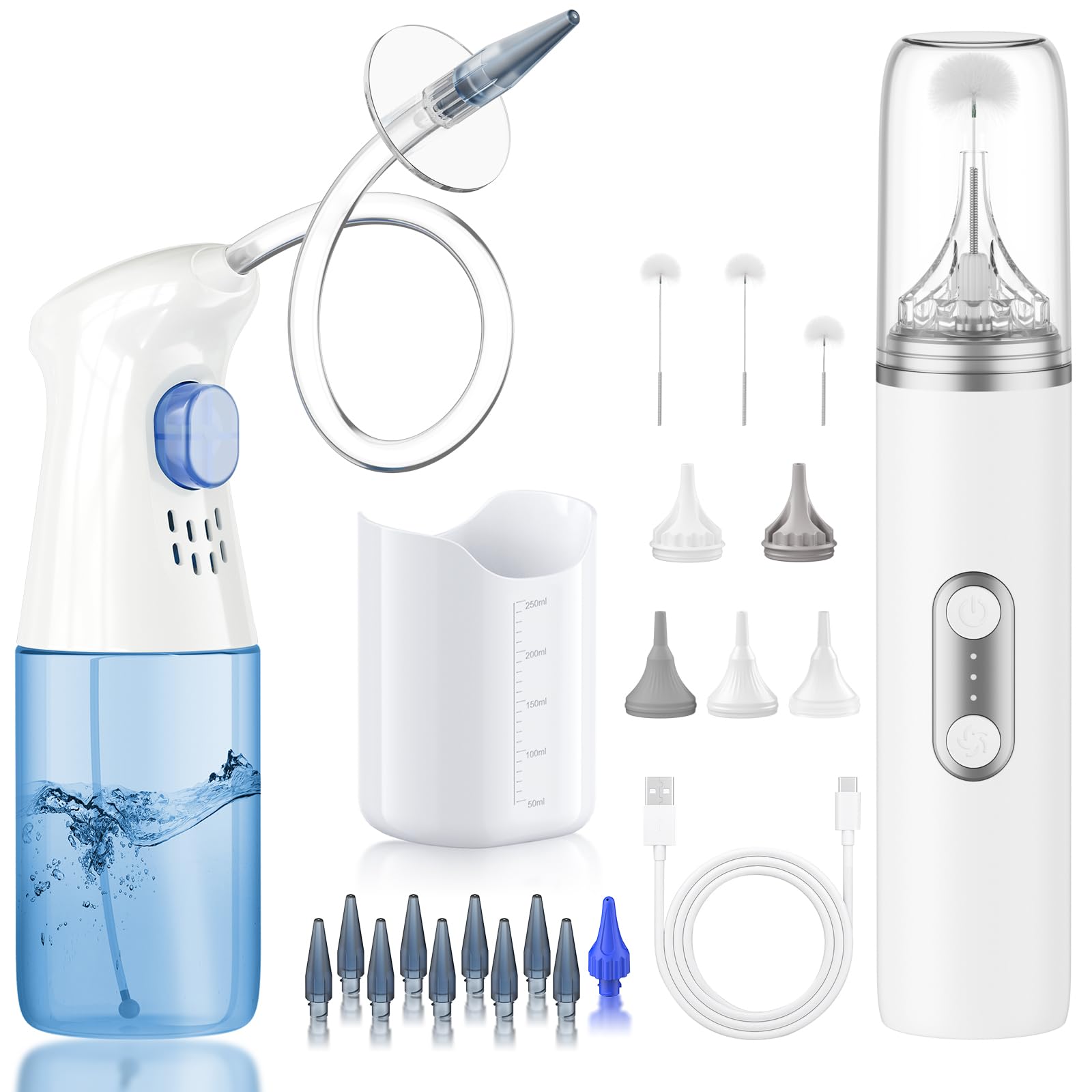 Your complete ear cleaning kit includes: Water bottle irrigator, 5-hole nozzles 1, 1-hole nozzles 10, ear b, ear dryer, dry ear protection cover 3, massage protection cover 3, massage accessory short rod 2, massage accessory long pole 2, USB cable, and easy-read guides. Start your ear wax removal routine today. Family-Friendly Ear Cleaner Earwax Removal:Soft silicone tips and comfy dry ear protectors make this ear care products safe for all ages. Kids and adults can comfortably ear wax remover buildup or dry swimmer's ears. (Parent supervision for children under 12). Massage Power Ear Dryers for Tired Ears:Long press the power button to activate your personal ear massager! Adjust speed levels to gently relieve ear pressure after flights, workouts, or long headphone, swimmer ear use. Combines warm air soft vibration for ultimate ear relaxation – like a mini spa for your ears. Comfort-First Ear Dryer with Soothing Glow:The ear flushing kit for adults feature uses gentle warm air to prevent moisture buildup. Its relaxing red light helps calm sensitive skin (great after ear flushing!). Simple one-button operation makes drying ears as easy as using a hairdryer. Multifunctional Ear Cleaning Tool: Your complete ear cleaning kit now with separate ear washer and electric ear dryer! Use the ear irrigation flusher to gently remove ear wax buildup, then switch to the compact ear drying for quick water-in-ear drying, After drying your ears, start massaging. all in one box for neat ear care at home. Safe Gentle Ear Wax Cleaner: Our ear irrigation flushing system features dual-tip nozzles (5-hole 1-hole) for adjustable waterflow, Gently wash away stubbom ear wax, dirt, and debris without discomfort. Plus, the included ear dryer for adults delivers soothing warm air to keep ears completely dry after cleaning.