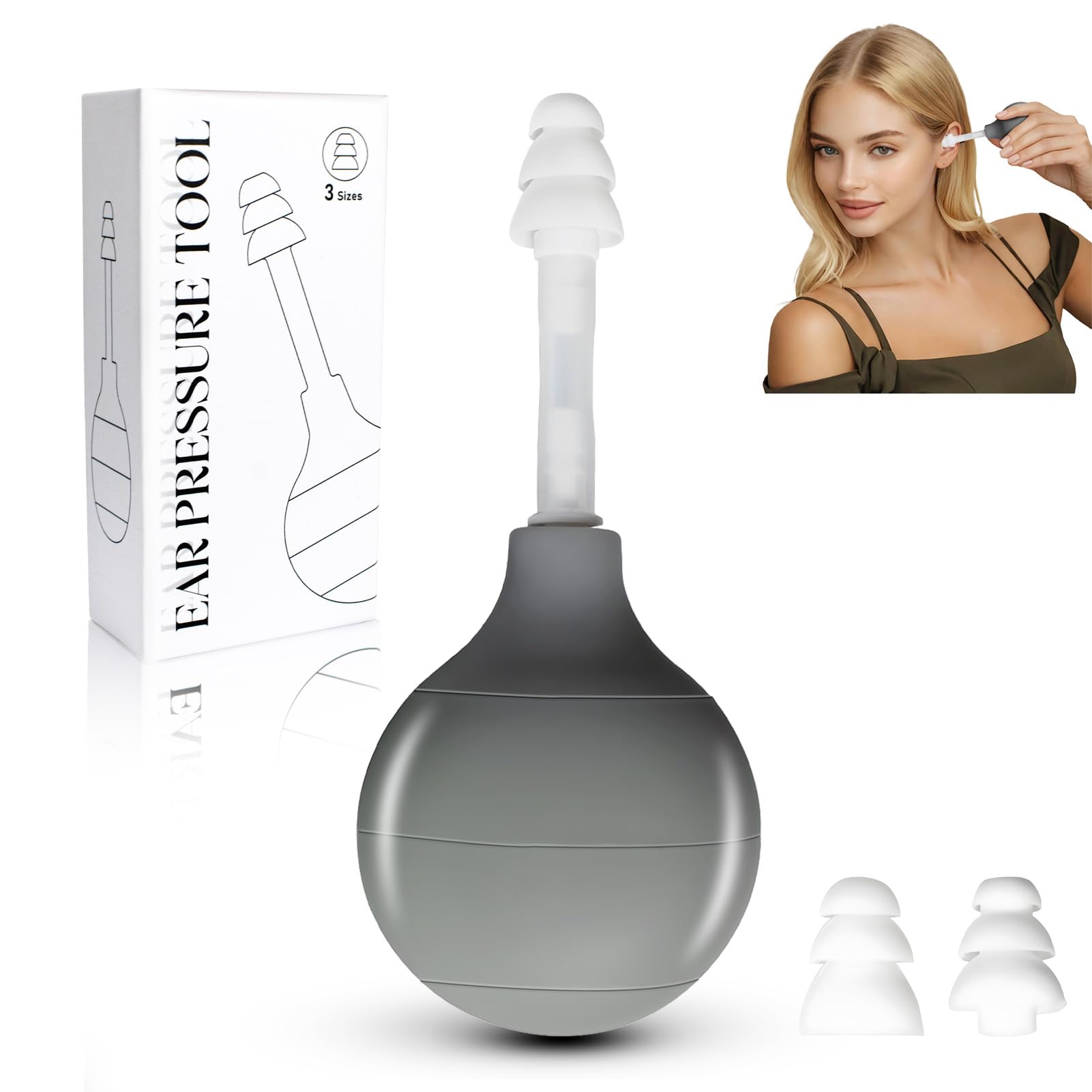 Multi-purpose: This ear pressure regulator can effectively ease tinnitus, earache or increased ear pressure resulting from colds, migraines, flights, diving and altitude changes. Help you balance ear pressure and keep the eustachian tube unclogged. Convenient to Use Take: Ear pressure relief comes with a small package case, compact and portable, not take up much space, perfect for travel and daily use. Whether you are on a plane, in a car or at home, you can easily relieve inner ear pressure whenever needed. Soft Comfortable: Made from soft silicone material, the ear pressure relief tool with 3 different sizes of replaceable earplugs is designed to fit snugly in the ear canal and ensure a comfortable gentle touch experience. Instant Relief: This reduce tension ear pressure tool provides immediate and natural relief by gently stimulating the inner ear with slight air pressure. It effectively alleviates inner ear discomfort caused by tinnitus or motion sickness. Safe Natural Treatment: Our ear pressure relief device works by activating the tympanic membrane and cranial nerves in the ear canal through pneumatic pressure stimulation to naturally reduce tension, pressure and symptoms likes migraine without side-effects.
