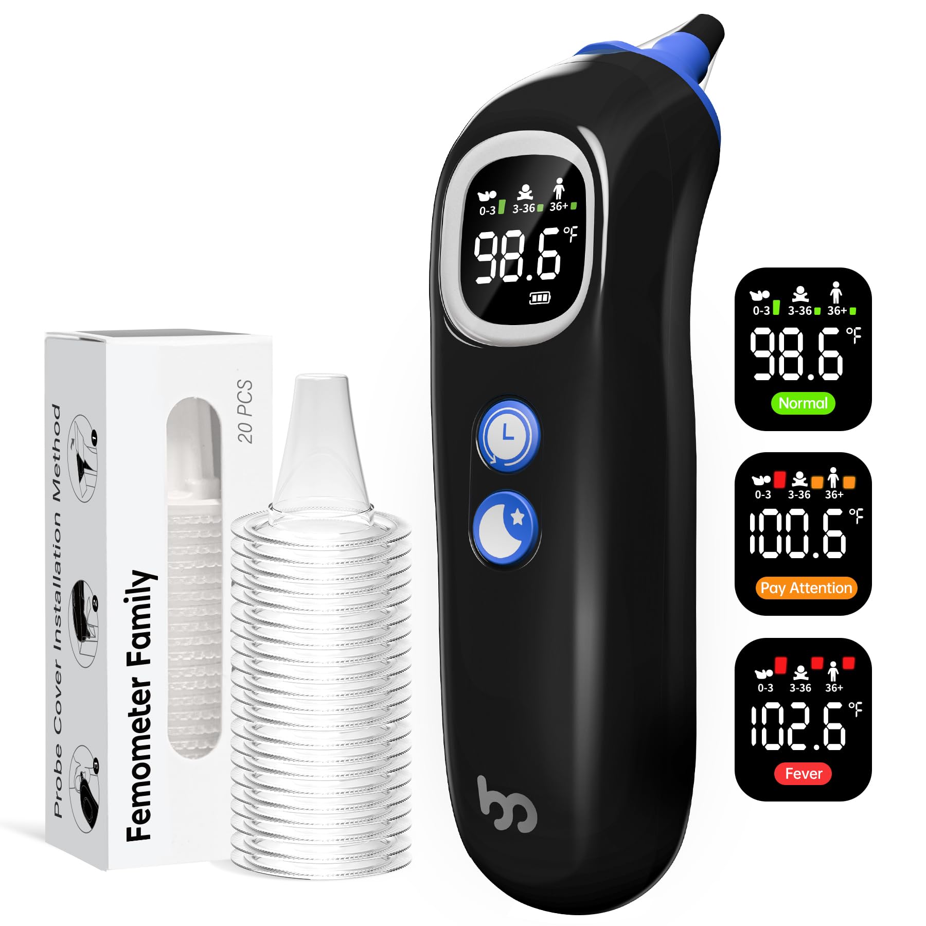 WHAT YOU GET - 1 x Ear Temperature Thermometer, 1 x Protective Case, 21 x Disposable Lens Filters, 2 x AA Batteries. You will also get 12 months replacement from the date of purchase and 24-7 friendly customer service. USER-FRIENDLY: Features an clearly and large LED display, easy to read even at night with soft backlit; 32 memory recalls track your family's health at any time; ? /? switchable dual mode fits the usage habits of different groups of people. 360° floating self-adaption probe easy to attach on and replace probe cover. SAFE & HYGIENIC - Your infrared ear thermometer come with 21 single-use protective covers to ensure accuracy and hygienic when taking temperature. We provide 1 protective case designed for durable use at-home and on-the-go use. MUTE MODE & NIGHT LIGHT - The unique one-touch mute and mini light functions allow you to measure the baby's temperature without disturbing the baby while they sleep in the night. The unique mini lamp can illuminate the outer wall of the ear canal, helping you find the correct measurement position. 3 SECOND FAST & ACCURATE - Femometer Family ear temperature thermometer is equipped with clinical high precision infrared sensor, a pre-warmed probe tip offsets ear canal cooling effect, the accuracy can be to ±0.4?/0.2?. It is a great digital ear thermometer for infants, toddlers, and adults.
