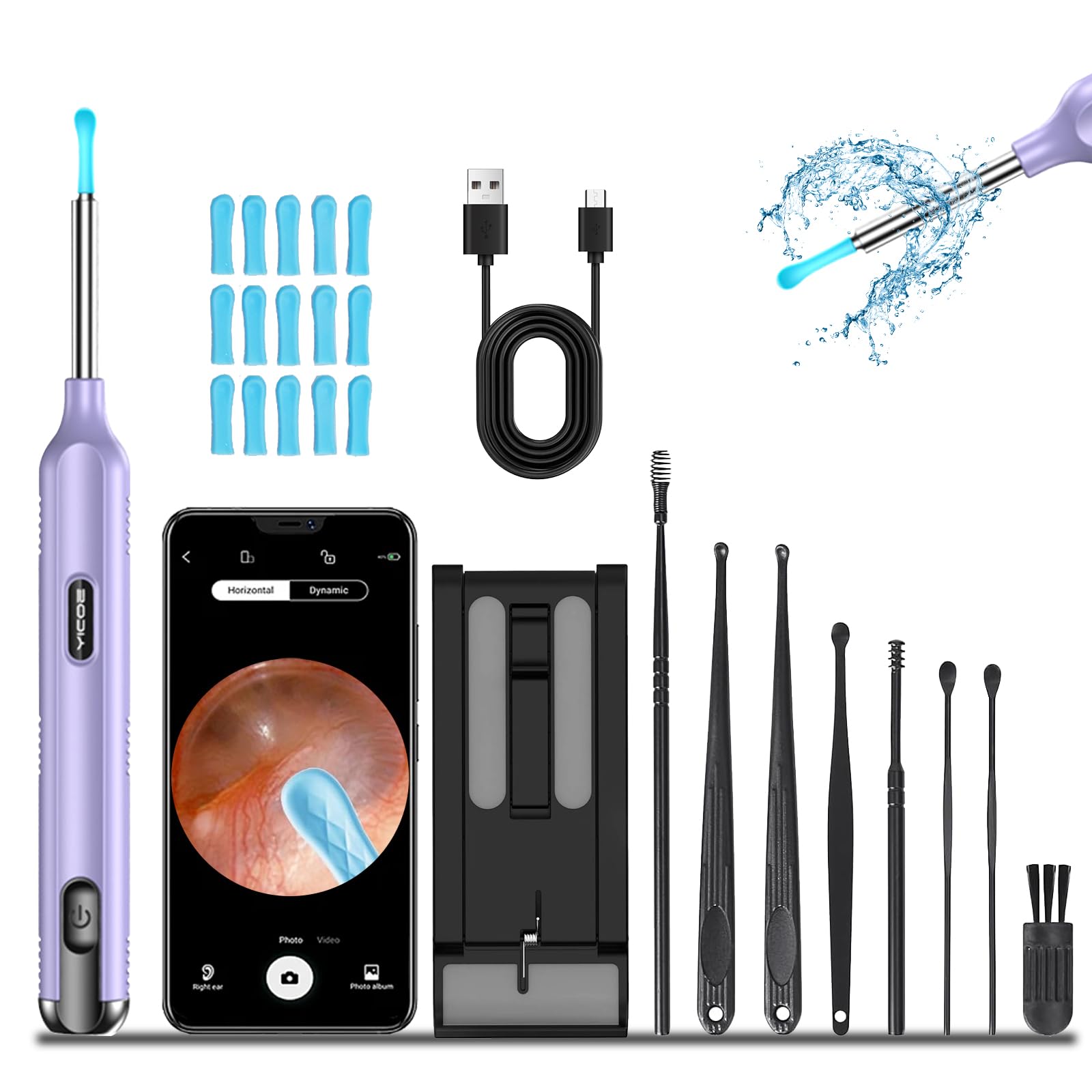 Earwax Camera Includes: 1 x HD Ear Wax Removal Camera Tool, 15 x Silicone Earplug Cover, 1 x Non-slip phone holder, 1 x Silicone Tips Storage Bottle, 7 x Traditional Ear Scoop Kit, 1 x Cleaning Brush, 1 x Charging Cable, 1 x User Manual. WIFI Connection and APP Control: Any WiFi-enabled device, whether an iOS, Android or Harmony phone or tablet, can easily connect to our "CT08" device. Simply scan the QR code or search for the "YICOE" app in the Apple Store or Google Play to download. Once installed, you can seamlessly connect the camera ear cleaner to the app via Wi-Fi. The app enables you to view and capture photos and videos, which you can then share with your loved ones. Long standby Easy to use: The ear cleaner with camera purple has a built-in 250mAh rechargeable battery, which can be used for 60 minutes after a full charge and has a standby time of up to 60 days. The IP67 waterproof otoscope with camera, ear spoon, and lens can be rinsed with water or wiped with alcohol cotton after use, Do not submerge the entire ear camera in water. 1200P HD Camera 360 Wide Angle: This ear cleaning camera is equipped with a 1200P HD camera and 6 LED lights to help you observe and clean earwax effectively. In addition to being an ear scope otoscope with light, you can also take HD pictures and videos in real time and have a wide field of view. With these features, earwax removal kit becomes safer and more convenient. Safe and Gentle Design:This is earwax removal kit with camera equipped with 15 silicone ear tips, which are easy to clean and replace without damaging the skin, thereby minimizing the risk of infection and ensuring long-term use. Every time you clean, just remove the used silicear wax removal tool cameraone ear tips and replace them with new ones. The exquisite non-slip mobile phone holder we give away can free your hands and clean your ears better, which is definitely your surprise.