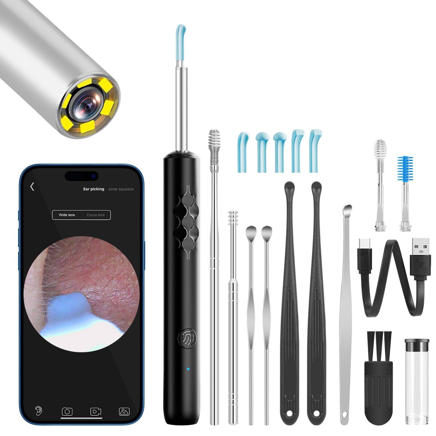 [Multiple Use]: Ear Cleaner is light and portable, It can also be used to check the mouth, nose, throat, scalp roots and other body parts for your pets or baby. Meanwhile the earwax removal kit is a perfect gift for your love at Thanksgiving, Christmas, Birthday. [Easy to Clean Comfortable to Use]: The ear wax spoons is made of high quality material. Aiming at the maximum comfort and ease of use, soft silicone spoons are applied, Moderate soft and hard,reasonable inclination angle, which can substantially reduce the harm potential created from accidental hits of eardrum. After using the ear spoon, Please clean with water or wipe with alcohol. [Wireless USB interface]: Our earwax cleaner tool with camera lens comes build in high quality 230mAh battery which can last for about 60min continuous working time or 20-day standby time. When it needs to be charged, it only needs to be connected with USB socket. [Various Ear Pick Accessories]: The ear cleaning kit has 3 kinds of radian ear spoons to fit different people's ear canal widths. The ear spoon cover is made of advanced soft silicone, which can give you a comfortable ear picking experience. It also has the latest buckle design, which solves the problem of easy fall-off. It also provides 7 traditional ear scoop tools for your choice. [1920P FHD Camera 360 Wide Angle]: The otoscope has a higher definition camera than others for supporting video and pictures. The 360 wide angle function makes ear wax no where to hide. When using it for the first time, please get used to the touch of the ear pick in the ear canal and move it gently and slowly.