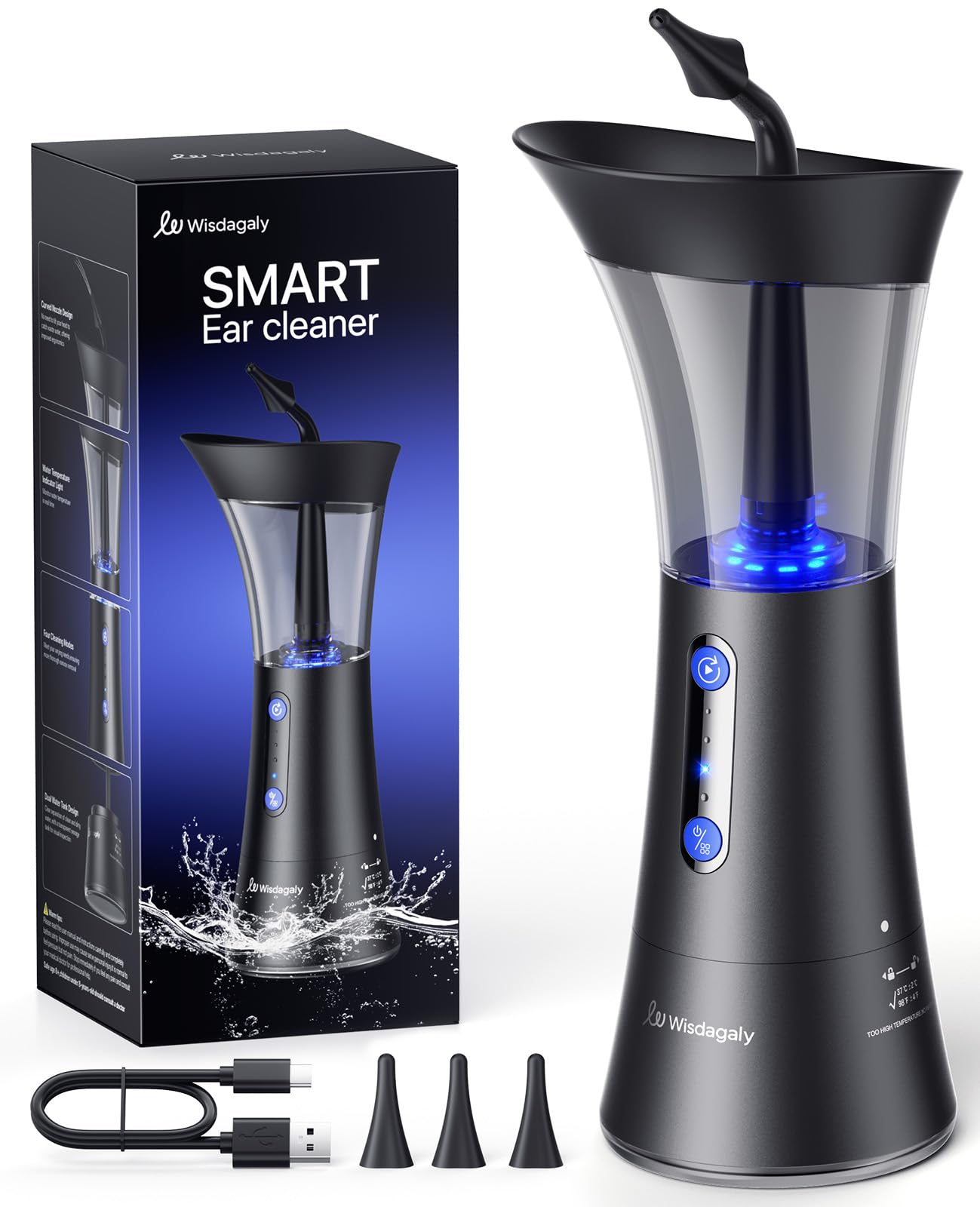 Perfect Gift: Are you searching a gift for Christmas, Thanksgiving, Birthdays, Valentine's Day, or the New Year? this exquisitely packaged smart electric ear cleaner is a practical, thoughtful and unique present that shows your love to your family or friends. What You'll Get: one electric ear cleaner, three replacement nozzle, one USB-C charging cable, one user manual. Warm Tips: we recommend using warm water and follow the steps in instruction manual when using it for the first time. Long Battery Life: Ear wax removal tools built in 900mAh rechargeable battery, provides 60 days of battery life, without frequent charging. It comes with a Type-C charging cable, no need for USB-A to USB-C, and the LED indicator makes you know the device's power status. 4 Modes and Curved Nozzle Design: This ear flushing kit for adults equipped with 4 pressure modes(soft-normal-strong-pulse) to suit different personal care needs. Ear irrigation flushing system has 3 replacement tips, you can replace it with new one after a period of use. And the ergonomic curved nozzle design, prevents leakage during use, offering a safe and comfortable ear-cleaning experience. Water Temperature Sensor and IPX6 Waterproof: Our earwax removal kit has a water temperatureindicator for real-time monitoring. With green light indicates the ideal water temperature, blue and red lights indicate low and high temperature. Also, this ear cleaner is safe to use in most environments, and easy to clean after each use. Large-Capacity Dual Water Tank: Wisdagaly electric ear wax removal kit features a dual-tank system that can automatically collects waste water during ear cleaning. This upgraded ear wax cleaner equipped with a 200ml transparent wastewater tank, there's no need to worry about sewage overflow. And One-handed operation ensures a cleaner and more convenient cleaning process.