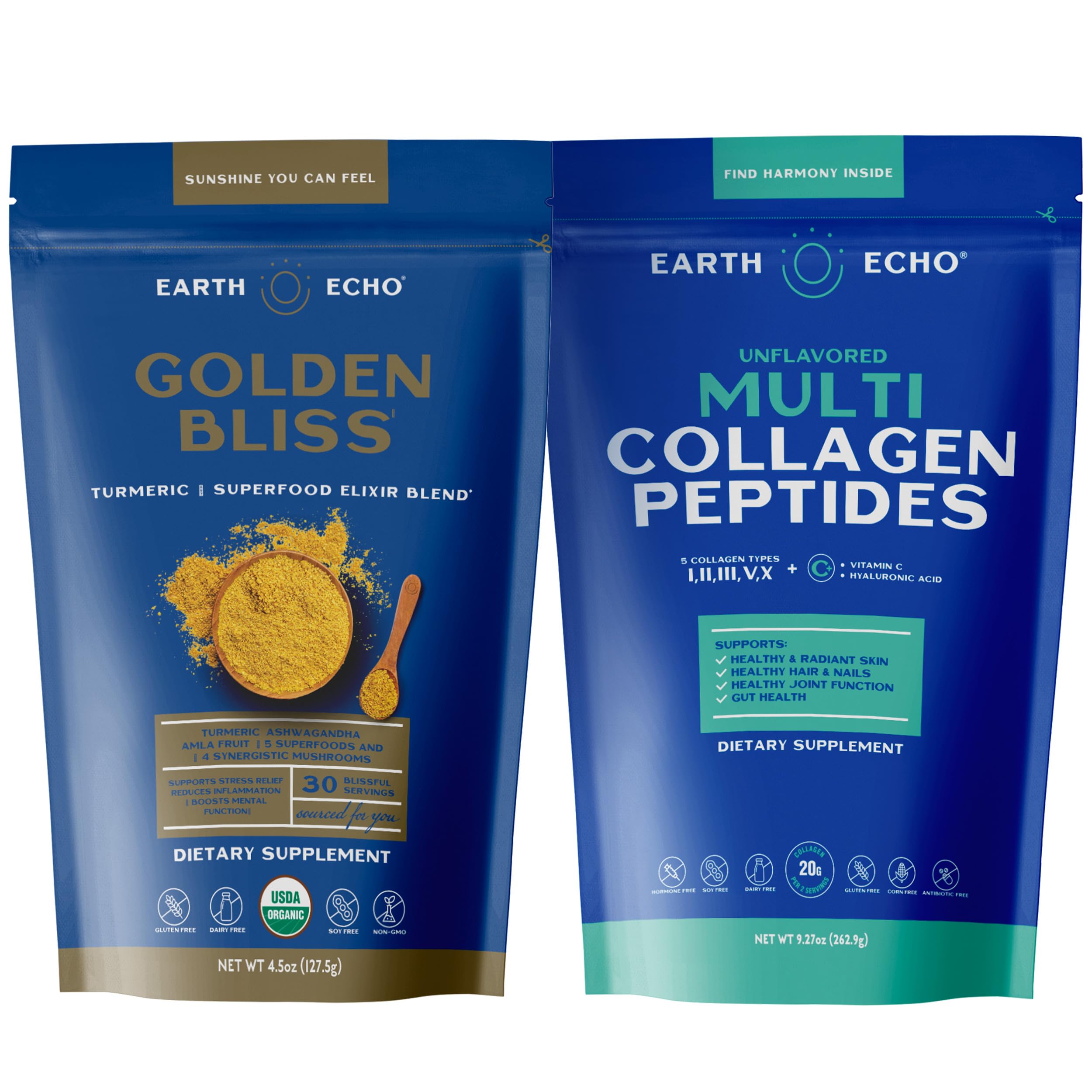 Blending Science and Soul: Earth Echo believes that when you feel good, you do good. That's why we source high-quality organic, non-GMO superfoods and use mindful packaging that honors Mother Earth. Every order supports a movement dedicated to wellness and planetary care, showing that premium nutrition and responsible sourcing go hand in hand. Mindful Daily Rituals: Incorporate Multi-Collagen Peptides powder into your midday routine by mixing it into your favorite beverages for convenient protein supplementation, then transition to Golden Bliss golden milk powder 1-2 hours before bed as your evening wind-down ritual. This simple two-step routine helps you build consistent daily habits that honor both quality time and ingredient transparency from afternoon through evening. Perfect Midday Evening Pairing: These two premium blends are strategically designed to complement your daily schedule. The unflavored Multi-Collagen Peptides seamlessly integrates into your afternoon beverages—from smoothies to coffee—without altering taste, while the warming golden milk provides a flavorful evening ritual with its signature gingerbread notes. Both dissolve completely in hot or cold liquids, making it effortless to maintain consistent daily supplementation that adapts to your. Soothing Golden Milk Blend: Indulge in this organic golden milk powder, thoughtfully crafted as a soothing nightcap. Its unique spicy-sweet flavor, reminiscent of gingerbread, delivers a comforting and delicious experience with the wholesome goodness of our superfood blend. Perfect for creating a calming evening ritual with premium organic turmeric, cinnamon, and adaptogenic herbs in every serving. Multi-Source Collagen Blend: Features 5 collagen types (I, II, III, V X) sourced from four clean origins: grass-fed bovine, wild-caught marine, free-range chicken, and eggshell membrane. Easily mixes into beverages for convenient daily use as part of your routine — delivering a balanced source of collagen support.