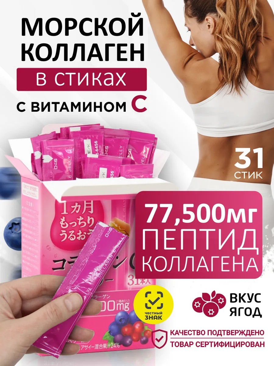 Composition per package (31 sticks): collagen (fish) 77500 mg (2500 mg in 1 stick), Vitamin C 109-797 mg, Glucosamine 223 mg, Chondroitin sulfate 111 mg, Proteoglycan 13 mg, Mangosteen extract 111 mg, Low molecular weight polyphenols 46 mg, Caffeine 0 mg