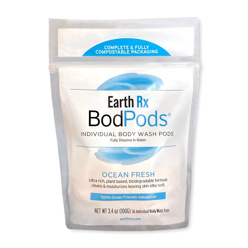 Perfectly Sized: Each bodpod contains just enough Ocean Fresh Blend body wash for one luxurious shower. Vegan Blend: BodPods are completely derived from plants and are gluten free, GMO free and EarthRx NEVER tests on animals. Free of Harsh Chemicals: No preservatives, sulfate free, paraben free, no added color or dye and phthlates free. 100 Ocean Friendly Personal Care: Bodpods deliver a pure clean with extra mild, ultra-rich ingredients that moisturize your skin while eliminating the need for harmful plastic bottles or containers. Giving You A Pure Clean and Beautiful, Soft, Silky Skin: BodPods are single use body wash packs made of biodegradable plant-based ingredients that are gentle on both the skin and the environment.
