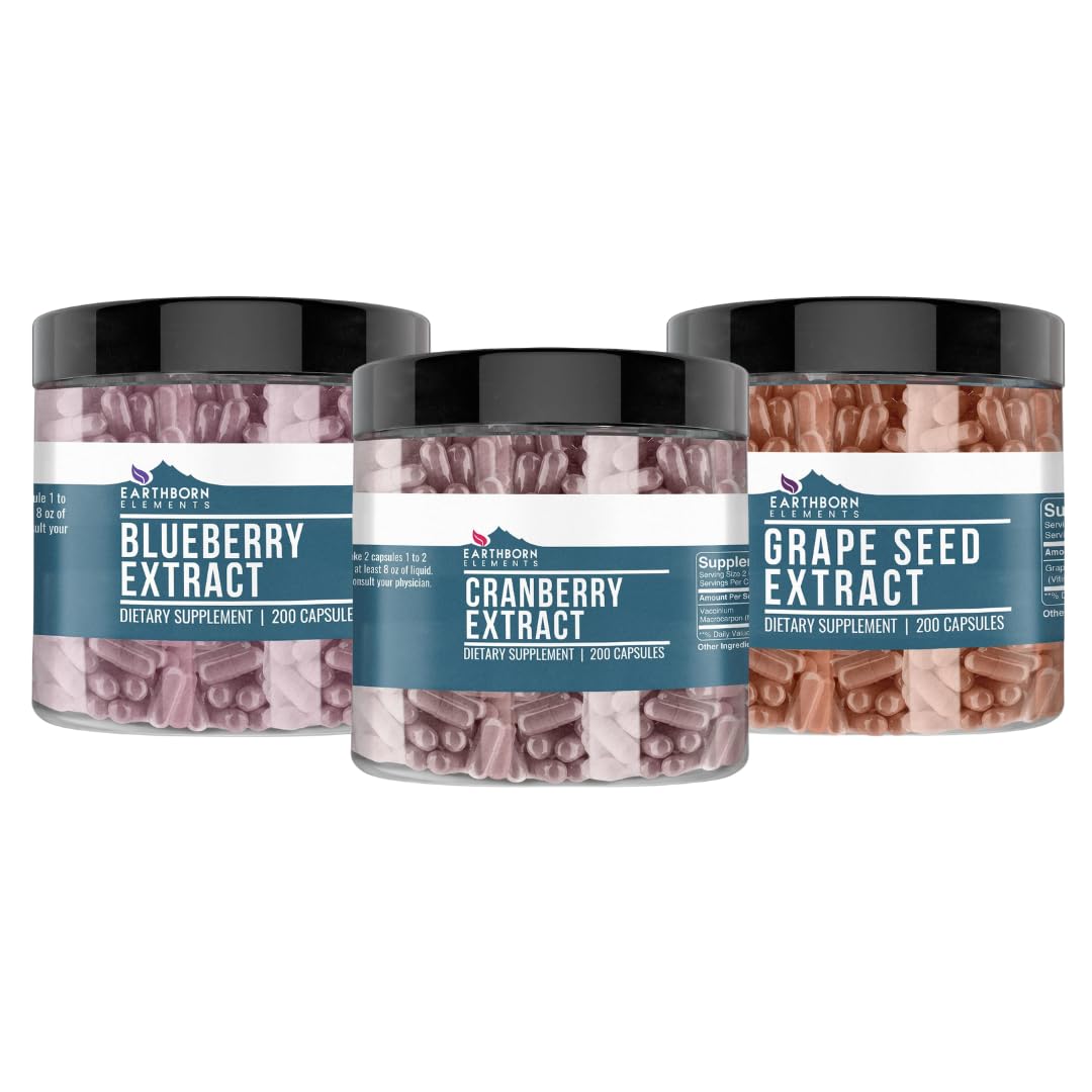 Earthborn Elements Grape Seed Blueberry & Cranberry Extract Capsule Bundle (200 Capsules Each) Pure & Undiluted No Additives