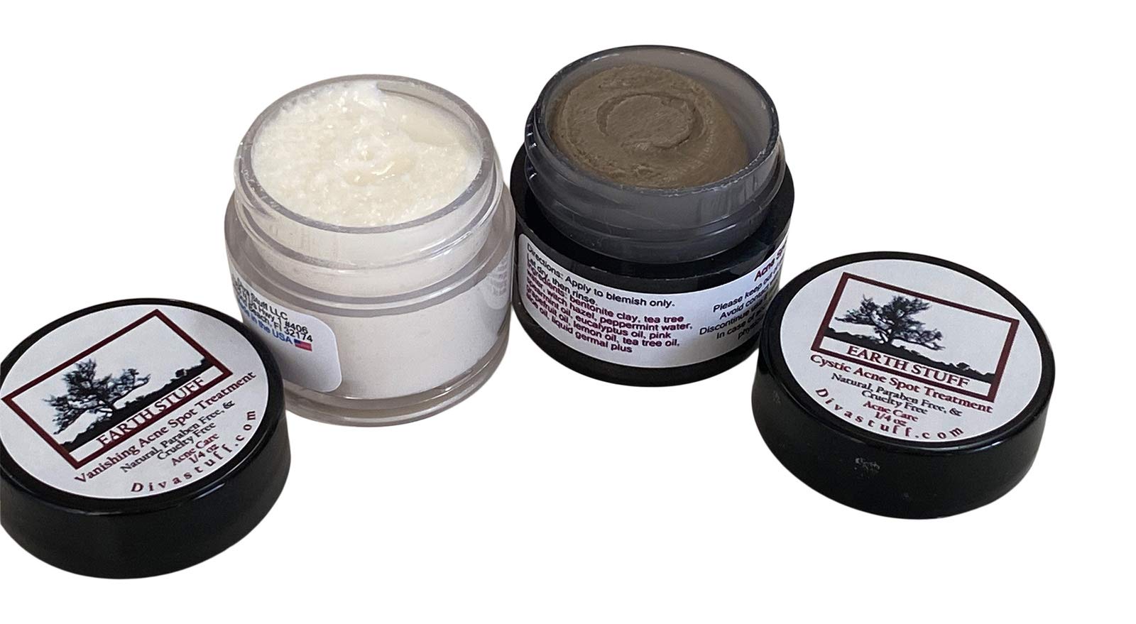 You get one of each because each pimple is different. One can be used under or over make up and goes on clear. The other is great for a night treatment. Our Vanishing Acne Spot Treatment is the original all natural formula. Do not be fooled by expensive products. Why are we able to offer this product for much less? We formulated it, we manufacture it, we fill it, we label it, and we ship it. This original formula is free of cheap added carrier oils that do not help acne. The only carrier oil in this product is jojoba oil which helps keep skin from becoming damaged and is non clogging. Apply as often as needed throughout the day or night. Gently massage a small amount right into the blemish or forming blemish and do not rinse off. Comes in a 1 4 oz jar. Don't be fooled by expensive brands and products . This is the original formula at a fraction of the cost. Why can we offer this product for less? We formulated it, manufacture it, fill it, label it and ship it. It contains all of the essential ingredients needed to treat cystic, severe, mild and hormonal acne. The base is bentonite clay which absorbs oils and toxins deep within the skin. The unique combination of ingredients work together to shrink blemishes swiftly. Peppermint reduces the production of sebum. Tea tree has been used for centuries to treat skin blemishes by reducing redness and swelling and drying up the blemish. Lemon helps to rid the skin of dead skin that clogs the pores and spearmint offers a cooling sensation while unclogging pores. Apply directly to the blemish or forming blemish. Allow to dry then rinse clean and reapply. May apply as often as needed or sleep with it on overnight. Ingredients: Bentonite clay, distilled water, tea tree water, peppermint water, tea tree oil, tea tree water, spearmint oil, eucalyptus oil, lemon oil, grapefruit oil, liquid germal plusMade with high end ingredients known to heal cystic, hormonal, teen, mild and severe acne. All natural, made in the USA. Reduces inflammation, redness and dries out pimples. One goes on clear and can be worn under or over makeup and the other is great as an overnight treatment. Two different fast acting formulas.
