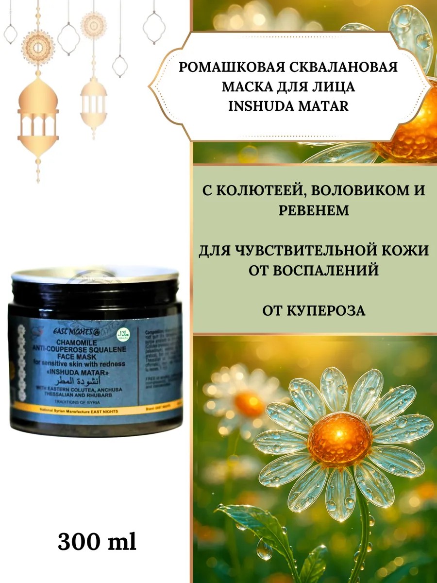 | Полное наименование товара | Ромашковая противо куперозная скваленовая маска для лица для чувствительной кожи c покраснениям с колютеей восточной, воловиком фессалийским и ревенем INSHUDA MATAR «Песнопение о дожде» |