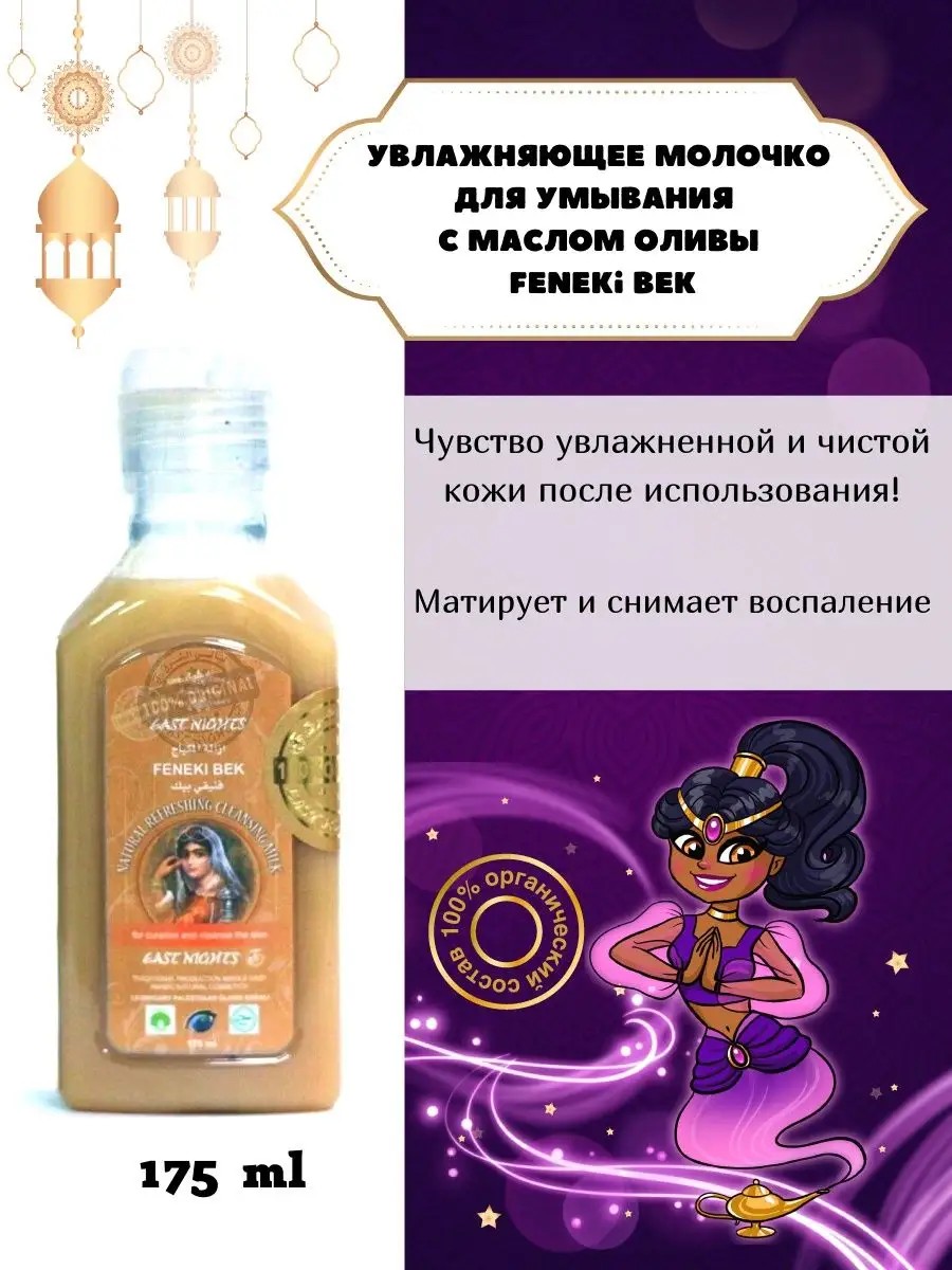 Очищение – ключевое слово в уходе за кожей. Ни один крем и ни одно масло не сможет решить дерматологические проблемы, если кожа не будет должным образом подготовлена. Полностью натуральное средство FENEKI BEK – это очищающее молочко, которое не только удалит загрязнения, но и увлажнит кожу, щедро одарив ее витаминами и микроэлементами.В косметичке каждой женщины, которая заботится о красоте и молодости своей кожи, обязательно должно быть очищающее молочко. Оно бережно очищает загрязнения, не травмируя и не стягивая кожу, и одновременно дарит ей нежную заботу.Косметическое молочко FENEKI BEK – находка для обладательниц привередливой кожи, которая требует к себе повышенного внимания. Оливковая эмульсия из оливок сорта Набали, которая входит в его состав, успокаивает кожу, делает ее мягкой и дарит ей благородное сияние.В комплексе с маслом оливки работает масляный экстракт цветов лаванды пустынной. Он прекрасно очищает кожу, устраняя воспаления и высыпания. Гидролат календулы палестинской превосходно освежает кожу, матирует ее, избавляет от сыпи и раздражений, а масло томатных семян осветляет кожу и выравнивает ее рельеф.* **Оливковая эмульсия** в короткие сроки возвращает коже здоровье и улучшает цвет лица. Эмульсия глубоко увлажняет, питает и смягчает кожу, повышает ее упругость.* **Масляный экстракт цветов лаванды** пустынной очищает и осветляет кожу. Обладая антисептическими свойствами, он не позволяет размножаться бактериям и микробам. Кроме того, масляный экстракт лаванды улучшает микроциркуляцию, способствует регенерации и возвращает коже молодой и здоровый вид.* **Масло томатных семян** – лучший друг проблемной кожи, склонной к воспалениям, пигментации, мелким морщинам и неровностям рельефа. Словно волшебным ластиком масло семян томата стирает с лица признаки возраста и усталости, делая его молодым и сияющим.* **Масло семян амаранта метельчатого** уважают косметологи всего мира, ведь оно содержит витамины красоты A, F и E, которые стоят на страже молодости кожи. Увлажняющие и смягчающие свойства этого масла оценит даже самая сухая и капризная кожа, а антибактериальный барьер, которое оно создает, даст отпор микробам и бактериям.* **Масло семян вечерней примулы** подходит для всех типов кожи. Оно увлажняет, заживляет воспаления и микротрещины, разглаживает морщины и неровности рельефа, успокаивает и защищает от агрессивного воздействия окружающей среды.* **Масло мякоти косточек плодов ши** отвечает за выработку коллагена и надолго сохраняет кожу упругой и подтянутой. Регенерирующие свойства масла ши восстанавливают микроповреждения, реставрируют морщинки и заменяют регулярные посещения кабинета косметолога.* **Масло косточек сливы** прибрежной увлажняет кожу, смягчает ее и питает. Фитогормон ситостерол повышает тонус кожи, возвращая ей молодость. Регулярное использование этого масла как в чистом виде, так и в составе уходовых средств повышает сопротивляемость кожи и предупреждает появление микротрещин.* **Пудра природной смолы бензоин суматранский** – полностью натуральный консервант, который сохраняет природную косметику свежей и долго не позволяет ей портиться.* **Гидролат календулы палестинской** улучшает цвет лица, увлажняет кожу, тонизирует и регенерирует, постепенно сглаживая следы, оставшиеся от акне и других дер