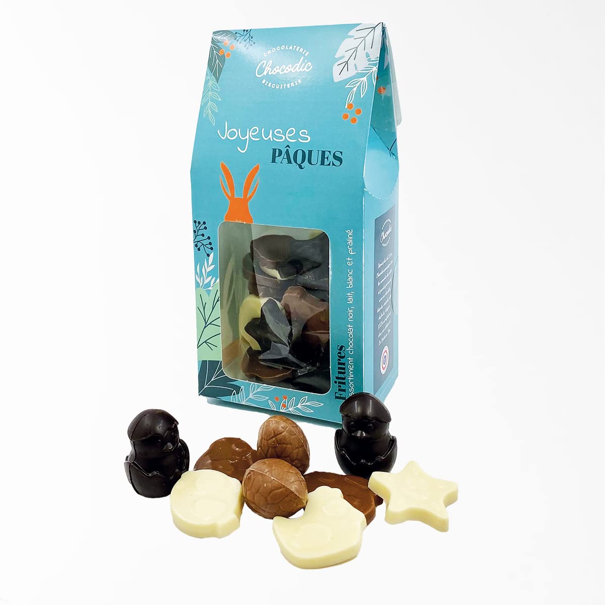 box containing delicious fritters in 73 cocoa dark chocolate, milk chocolate, white chocolate, caramel chocolate as well as delicate fritters with a flaky praline heart in 73 cocoa dark, milk and white chocolate. 150g box - 18x8.5cm - Beautiful box ready to offer. Easter molds 100 artisanal and French made.Un coffret contenant de savoureuses fritures en chocolat noir 73 de cacao, chocolat lait, chocolat blanc, chocolat caramel ainsi que de délicates fritures coeur praliné feuilleté en chocolat noir 73 de cacao, lait et blanc. Coffret 150g - 18x8.5cm - Joli coffret prêt à offrir. Moulages de Pâques de fabrication 100 artisanal et Française.