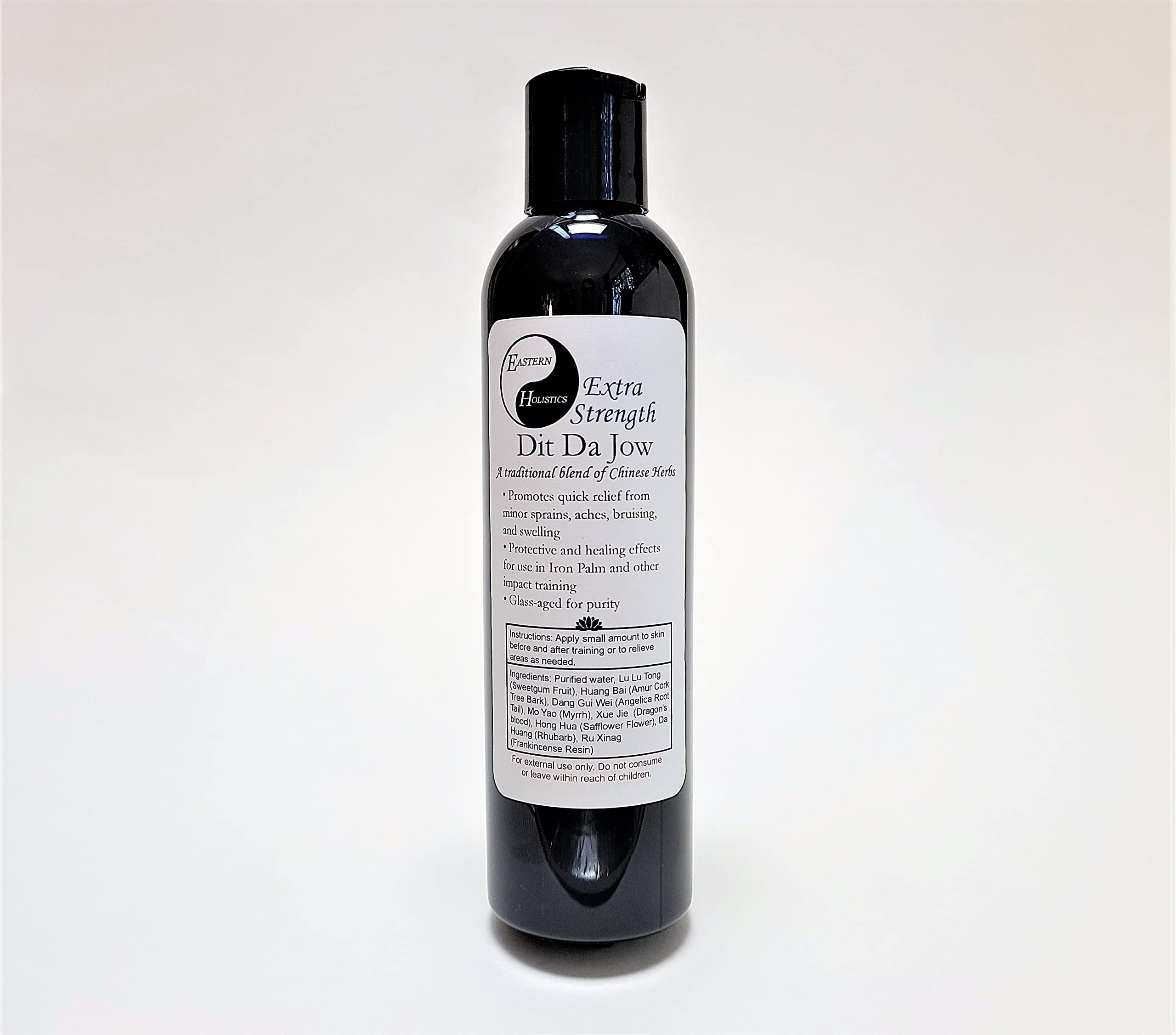 Dit Da Jow is a chinese natural ointment crated by a proprietary blend of herbs that has been used for thousands of years by martial artists. Eastern Holistics Dit Da Jow is glass-aged underground for at least 2 years and only bottled per order to avoid leaching from low quality plastics. The Extra Strength has been aged longer and contains parts of the herbs still inside, making it continuously stronger over time. The top is able to be screwed on and off, and the spout design allows drops to come out when turned upside down for precise application amounts. Has a musky odor, and is reddish brown in color. This product stains clothing and fabrics very easily, they should be cleaned immediately on contact. Keep out of reach of children, do not consume under any circumstances. Ingredients: Purified water, Lu Lu Tong (Sweetgum Fruit), Huang Bai (Amur Cork Tree Bark), Dang Gui Wei (Angelica Root Tail), Mo Yao (Myrrh), Xue Jie (Dragon's blood), Hong Hua (Safflower Flower), Da Huang (Rhubarb), Ru Xinag (Frankincense Resin)