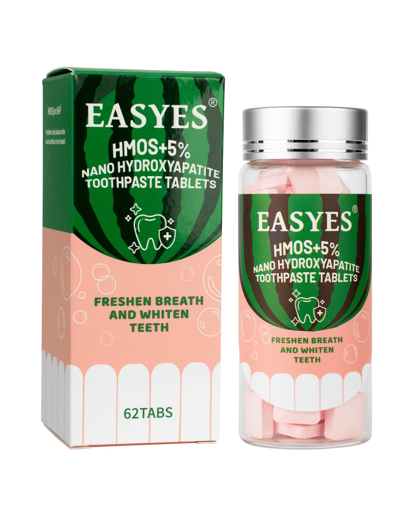 EASY TO USE TRAVEL-FRIENDLY: Simply chew, brush and rinse—no liquid, no mess, no leaks. Compact toothpaste tablets are perfect for travel, work, and on-the-go oral care. ECO-FRIENDLY CHOICE: Made with recyclable glass packaging and compressed tablets to help reduce single-use plastic and support more sustainable oral care habits. SAFE FORMULA: A fluoride-free, non-abrasive formula that is enamel-safe and suitable for sensitive teeth. Probiotic powder supports daily oral balance, while triple cleansing factors provide a thorough yet gentle clean. ORAL BALANCE: Powered by HMOs prebiotics and probiotics to help support a balanced oral environment and promote long-lasting fresh breath throughout the day. ENAMEL CARE: Easyes Toothpaste Tablets are formulated with 5 nano-hydroxyapatite, a biomimetic mineral that mimics natural tooth enamel to help support remineralization and strengthen teeth with gentle daily use.
