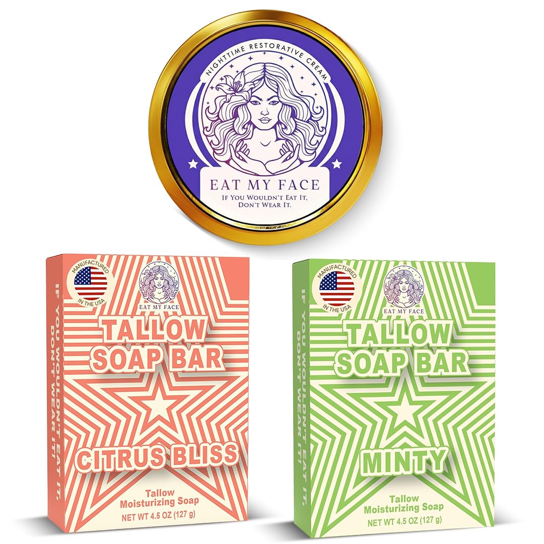 Experience the ultimate in natural skincare with the Eat My Face Tallow Skin Care Bundle, featuring a nourishing night cream and two multi-purpose soap bars in Citrus Bliss and Mint. The grass-fed beef tallow night cream, enriched with shea butter, cocoa butter, vitamin E, and sea buckthorn, deeply hydrates and restores your skin overnight, helping reduce fine lines and promote a youthful, radiant glow. The Citrus Bliss and Mint soap bars provide gentle, all-over cleansing for face, body, and hair, leaving skin soft, smooth, and refreshed without stripping essential moisture. Crafted with 100 organic, food-grade tallow and natural oils, all three products are hypoallergenic, chemical-free, and safe for sensitive skin. Sustainably sourced and eco-friendly, this bundle delivers effective, clean skincare for men, women, and even babies, making it perfect for daily use and whole-family care. - : All three products are made with sustainably sourced ingredients and minimal packaging. Enjoy natural, effective skincare while supporting a greener, cleaner lifestyle. , : Made with 100 grass-fed beef tallow and natural oils, these products are hypoallergenic, chemical-free, and safe for adults, teens, and even babies. Gentle enough for sensitive skin and daily use. - : This bundle includes two tallow soap bars—Citrus Bliss and Mint—designed to cleanse face, body, and hair. Their rich lather nourishes the skin without stripping moisture, ideal for all skin types. - - : Infused with vitamin E and sea buckthorn, this restorative cream helps reduce fine lines, improve elasticity, and restore a youthful, healthy glow while you sleep. : Our grass-fed beef tallow night cream, enriched with shea butter and cocoa butter, delivers intense hydration for face, neck, and body. Wake up to soft, smooth, and revitalized skin every morning.