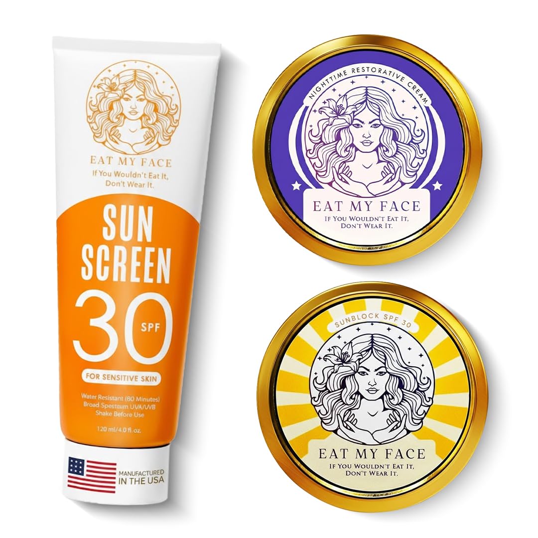 Experience complete skin care with the Eat My Face Tallow Skin Care Bundle, featuring a deeply hydrating night cream and two versatile sunscreens. Our night cream, crafted with grass-fed beef tallow, shea butter, cocoa butter, vitamin E, and sea buckthorn, nourishes and restores skin overnight while helping reduce fine lines and boost elasticity. The included mineral sunscreens, one tinted and one classic, use non-nano zinc oxide and organic beef tallow to provide broad-spectrum SPF 30 protection that is gentle, reef-safe, and suitable for all skin types. Lightweight, non-greasy, and travel-friendly, they hydrate, protect, and nourish your skin whether you're at the beach, on the go, or enjoying everyday activities. This bundle is perfect for men, women, and sensitive skin, offering a natural, multi-purpose solution for face, body, and sun care—clean, effective, and sustainably sourced.Multi-Purpose, Skin-Safe Bundle: Includes night cream for deep hydration and two sunscreens for daily sun protection. Gentle, organic, and sustainably sourced ingredients ensure complete care for face, body, and sensitive skin, keeping your routine simple and effective. Tinted Travel-Friendly Sun Protection: Mineral tinted sunscreen offers lightweight, water-resistant coverage with a subtle vanilla scent. Perfect for face and body, beach days, sports, or travel—smooth, fast-absorbing, and non-greasy. Reef-Safe Mineral Sunscreen SPF 30: Organic beef tallow with non-nano zinc oxide, shea butter, and sea buckthorn provides broad-spectrum UVA UVB protection. Non-toxic, chemical-free, and biodegradable, safe for sensitive skin, babies, and the environment. Calming Restorative Formula: Lavender and chamomile soothe sensitive skin, reduce redness, and promote a balanced, relaxed complexion while you sleep. Hypoallergenic and free from harsh chemicals for safe, gentle use on all skin types. Deeply Nourishing Night Cream: Grass-fed tallow, shea butter, and cocoa butter deliver intense hydration and restore your skin's natural glow overnight. Vitamin E and sea buckthorn support elasticity, reduce fine lines, and leave skin soft, smooth, and revitalized by morning.