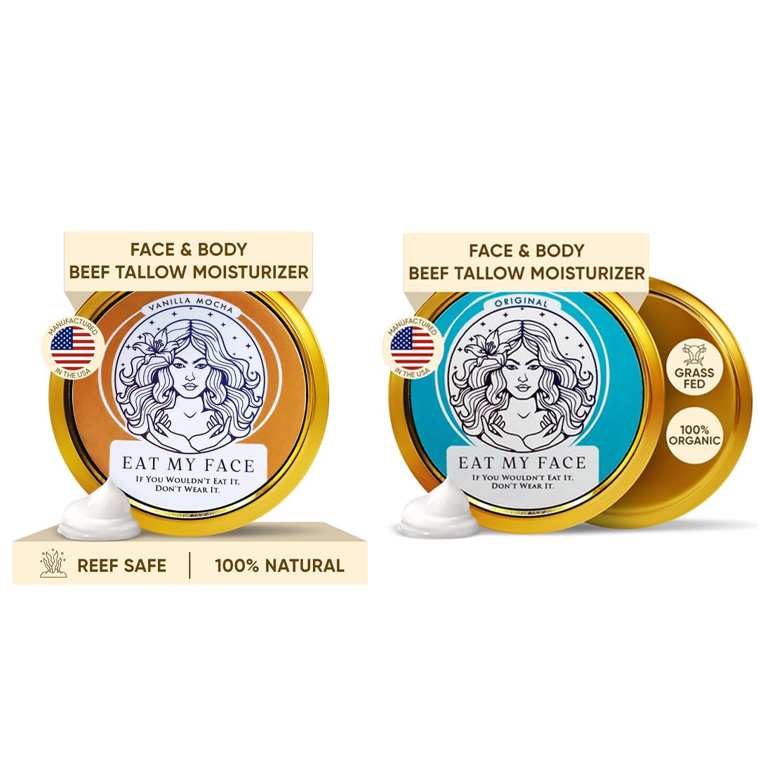 Pure Tallow Base: Revered for centuries, tallow provides unparalleled hydration, closely mimicking the skin's natural sebum. Shea Cocoa Butter: These natural emollients lock in moisture, ensuring soft, supple skin throughout the day. Jojoba Fractionated Coconut Oils: Lightweight and easily absorbed, they enhance the cream's spreadability without a greasy residue. Sea Buckthorn Oil: A vitamin C powerhouse, it promotes a radiant complexion and supports skin's natural barrier. Arrowroot Vitamin E: While arrowroot ensures a matte finish by absorbing excess oil, Vitamin E offers antioxidant protection against environmental stressors. Experience skincare as nature intended. With zero artificial additives, Eat My Face Original Cream is a tribute to purity, simplicity, and genuine beauty. Whether you have dry, oily, or combination skin, our balanced formula caters to all, providing hydration without heaviness. Join the skincare revolution. Choose Eat My Face, where nature meets tradition, and discover the secret to naturally radiant skin. Packaged in a recyclable metal tin to minimize environmental impact no external packaging used to reduce carbon footprint and landfill waste.MULTI-PURPOSE BEEF TALLOW MOISTURIZER FOR FACE AND BODY: Whether you need a tallow face moisturizer, beef tallow body lotion or a tallow lotion for body and face, this versatile tallow moisturizer and tallow cream does it all. Use it as a tallow hand cream, beef tallow for face, or all-over body balm. The rich blend of organic beef tallow for skin men and women makes it suitable for multiple needs, delivering hydration and care for every part of your skincare routine. FAST-ABSORBING AND NON-GREASY TEXTURE: Eat My Face beef tallow face moisturizer features a lightweight, non-greasy texture that absorbs quickly, making it ideal for daily use. Unlike heavy creams, this tallow moisturizer face works for oily, dry, or combination skin, delivering balanced moisture without clogging pores. Enjoy the benefits of pure beef tallow for skin with a smooth application that leaves no residue, just soft and nourished skin. NATURAL VANILLA SCENT, GENTLE, AND SAFE FOR ALL: Crafted with grass fed beef tallow for skin and free from harmful chemicals, our beef tallow balm is suitable for tallow skin care for the whole family. Infused with a light, natural vanilla scent, this tallow balm for face and body provides a soothing, subtle fragrance that enhances your skincare experience. Made with pure, high-quality ingredients, this facial tallow ensures a soft, smooth, and rejuvenated feel after each use. ANTI-AGING BENEFITS WITH NATURAL INGREDIENTS: Packed with antioxidants like vitamin E and sea buckthorn, our beef tallow moisturizer face, neck, and body supports healthy, youthful skin. This tallow face cream helps reduce signs of aging, protecting your skin from environmental damage and promoting a natural glow. The inclusion of organic beef tallow for face makes this tallow cream a wise choice in tallow skin care routines for long-lasting beauty. DEEPLY HYDRATING FORMULA: Our tallow face moisturizer combines the rich nourishment of beef tallow for face with shea and cocoa butter for deep hydration. This beef tallow face cream provides lasting moisture, ideal for beef tallow skin care on dry and sensitive skin. Gentle yet effective, this tallow cream works for all skin types. Ensure your skin stays soft, smooth, and radiant without greasy residue with our tallow face moisturizer.