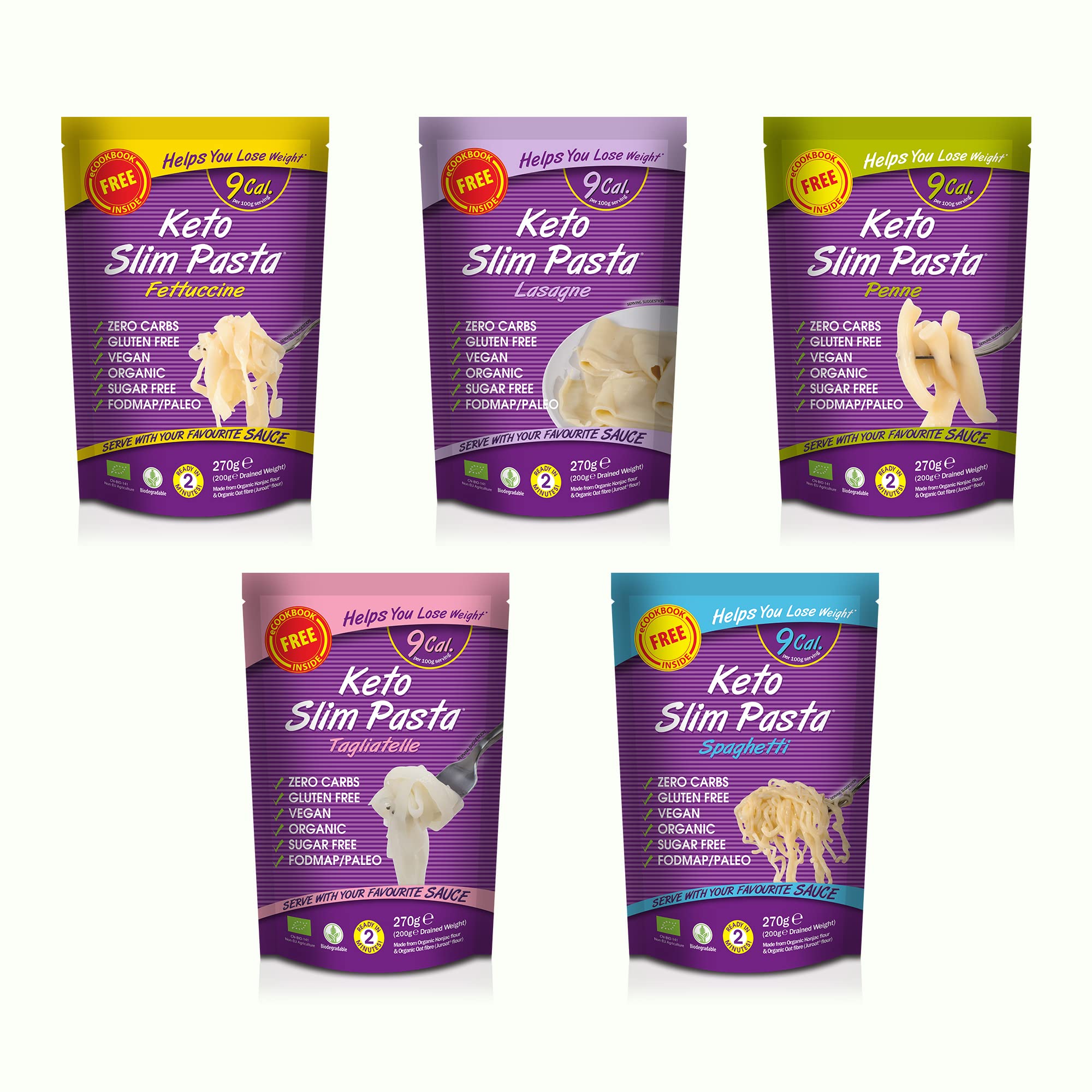 ENVIRONMENTALLY FRIENDLY – FULLY RECYCLABLE, MINIMAL PACKAGING – We use cardboard and minimize our plastic use to seal the flavour of each ingredient, so all our packaging is light and recyclable - our Slim Range cares about the environment with you. SLIM PASTA IS A UNIQUE PRODUCT ADJUSTABLE TO YOUR TASTE – thanks to the Juroat konjac recipe, Organic Slim Pasta looks identical to regular pasta. It keeps a firm al dente texture even after being microwaved and makes for a satisfying low-carb meal when accompanied with other ingredients. When preparing, simply rinse the pasta under water to remove the natural odour of konjac pasta. Suitable for hot stir fry dishes, soups, or salads… the list goes on!. ONLY TAKES 2 MINUTES! IT'S QUICK, CONVENIENT AND DELICIOUS – Open a pack, give it a quick rinse under cool water, and heat. Voila! It's that easy! The trick is what you add to it. Try our FREE 60-recipe e-cook book which comes in every pack. Great for quick meals, meal preps and home cooking with the family. A GREAT SOLUTION FOR VEGANS, VEGETARIANS AND DIABETICS – IDEAL FOR KETO, ATKINS, PALEO, LCHF DUKAN DIET FRIENDLY – Our Slim Range is 100 organic and vegan, making it a great alternative for those living with diabetes due to its zero carb and no sugar content. Great for weight watching with Keto, Paleo, and other diets. PROVEN FOR WEIGHT LOSS – ORGANIC KONJAC FLOUR OAT FIBRE WITH A LOW CALORIE, NO CARB NO FAT RECIPE – Scientifically proven for weight loss, this plant-based konjac pasta contains zero carbohydrates and a paltry 9 calories per 100g! Its suitable for people with our unique recipe called Juroat, this water and fibre rich food keeps you feeling full for longer - just like regular pasta.