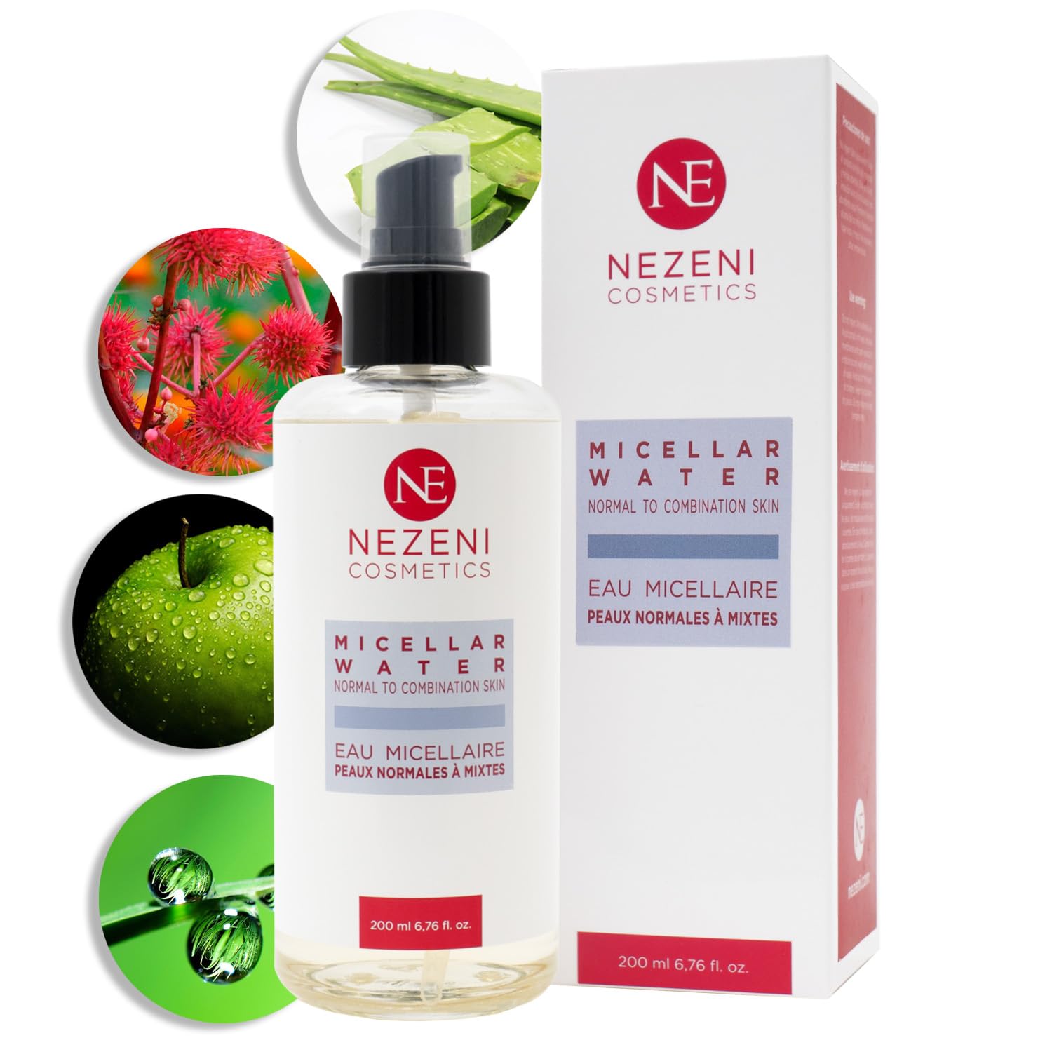 Eau micellaire Nezeni pour peaux normales, grasses et mixtes Nettoyant Démaquillant 200 ml 5 ingrédients actifs Végétalien FAIBLE EN CONSERVATEURS