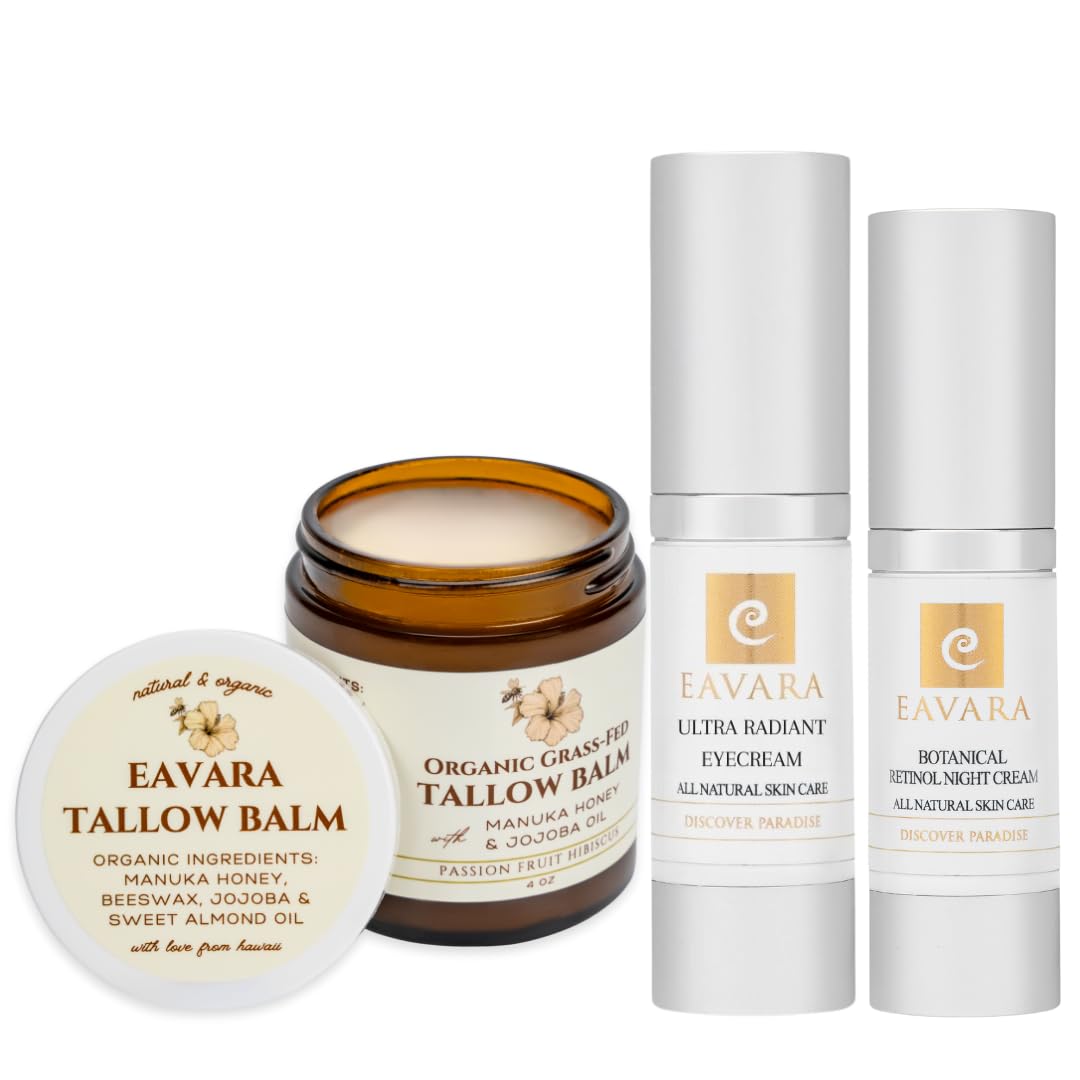 This luxurious trio is designed to soothe, hydrate, and restore your skin—day and night. Our Organic Eye Cream targets puffiness, fine lines, and dark circles with hyaluronic acid, aloe, and jojoba. The Retinol Night Cream works while you sleep to smooth texture and support skin renewal with plant-based retinol, shea butter, and hyaluronic acid. Seal in all that goodness with our Grass-Fed Tallow Balm, a rich, ultra-hydrating moisturizer infused with manuka honey and baobab oil. Clean, natural skincare for glowing, well-rested skin—perfect for dry and sensitive skin types.Pure Ingredients and Non-Toxic: Skincare should be clean and nourishing. That's why we only use the highest quality natural and organic ingredients—no parabens, phthalates, sulfates, or synthetic fragrances and chemicals. Our moisturizer is gently scented with pure essential oils from passionfruit and hibiscus. Every ingredient is thoughtfully chosen for its skin-loving benefits and safety. You can feel confident putting this on your skin knowing it's toxin-free, and crafted with care. Hydrating Under Eye Cream: Our 1-ounce eye cream hydrates, repairs, nourishes, and protects the delicate skin around your eyes, helping to reduce wrinkles, fine lines, and puffiness. Gentle and Natural: We paired Retinol with Organic Aloe Vera, Organic Shea Butter, Organic Coconut Oil, Vitamin E, and Organic Honey to ensure a well-rounded approach to restoring your youth and preserving your skin's natural radiance. Rejuvenate Your Eye Area: Hyaluronic acid rehydrates, high-quality oils support firmer skin, and antioxidants combat free radicals. Apply daily for best results. Original Skin Superfood: Rich in vitamins A, D, E, and K, grass-fed beef tallow deeply nourishes the skin with nutrients your body recognizes. Its structure is similar to your skin's natural oils, allowing for fast absorption and long-lasting hydration. Unlike water-based lotions, tallow locks in moisture without clogging pores or leaving a greasy residue. This time-tested remedy supports skin barrier function and promotes a smooth, healthy glow.