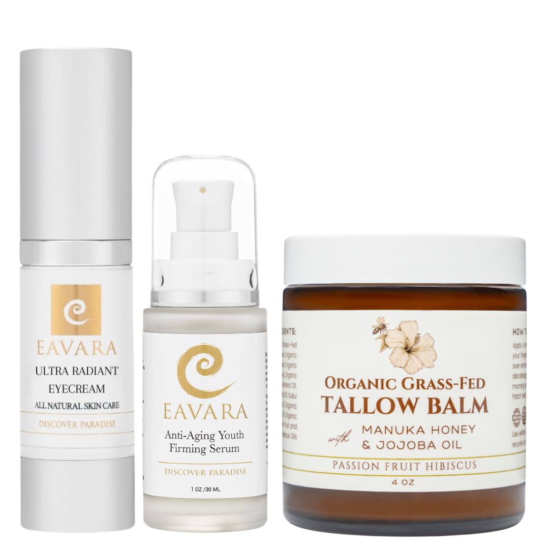 Eavara Eye Cream Facial Serum Tallow & Honey Balm Set Organic Skincare Trio with Grass-Fed Tallow Hyaluronic Acid Vitamin C & Manuka Honey Brightens & Deeply Moisturizes Sensitive Skin