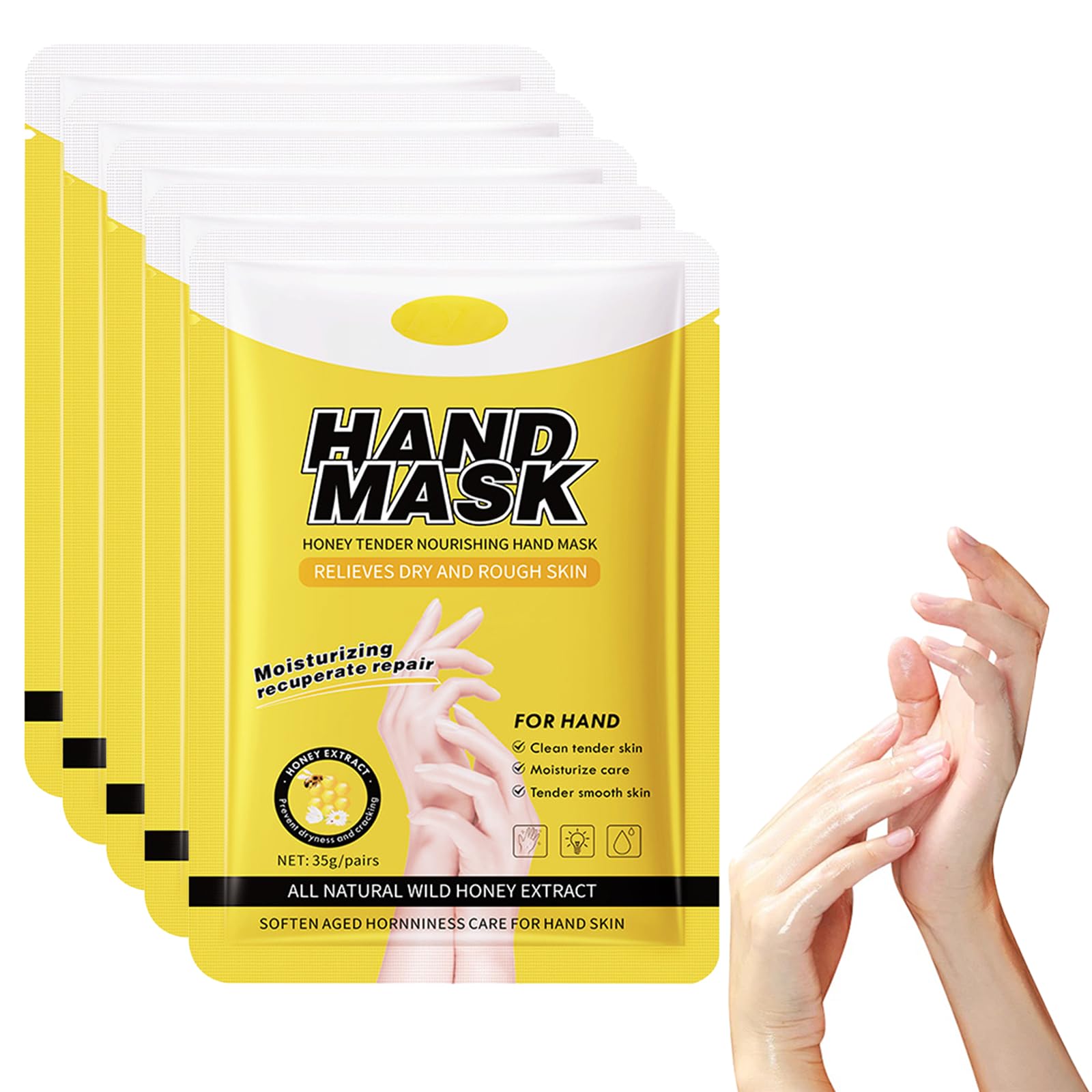 Healthy and Safe Hand Mask : Enriched with collagen, shea butter, vitamin E, and over 10 plant extracts, as well as honey and milk extracts. This vitamin-rich and highly moisturizing serum, concentrated with 10 plant extracts, provides intense hydration and effectively repairs dry, rough hands. This deep-cleansing, moisturizing repair mask helps exfoliate, hydrate, brighten, and intensely nourish, reducing fine lines and wrinkles caused by dryness and leaving skin soft and smooth. Ideal for dry, rough, and chapped hands. Easy to Use : The specially designed gloves allow your hands to be completely enveloped by the serum – beautiful and comfortable. Easy to use, whether at the office or at home: Clean and dry your hands, open the package, remove the gloves, put your hands on the mask, and relax for 20 minutes. You can use your mobile phone, browse the internet, or do housework—enjoy the hand care. Brightening and Anti-Aging This moisturizing hand mask firms the skin and gives it a youthful glow. The anti-aging serum reduces visible age spots and makes your hands look younger. Moisturizing Mask: Our hand mask gloves are infused with a rich, nourishing serum of shea butter and aloe vera, providing a spa treatment at home. Perfect for dry, chapped hands and as a gift for any skincare enthusiast.Eazerom 03 Lot de 5 paires de masques hydratants pour les mains - Réparation et renouvellement de la peau - Gants hydratants pour mains sèchesMasque pour les mains sain et sûr : enrichi en collagène, beurre de karité, vitamine E et plus de 10 extraits de plantes ainsi qu'en extraits de miel et de lait. Le sérum, riche en vitamines et hautement hydratant, concentré de 10 extraits de plantes offre une hydratation intense et répare efficacement les mains sèches et rugueuses. Masque réparateur hydratant en profondeur : aide à exfolier, hydrater, éclaircir, nourrir intensément, atténue les ridules et les rides de sécheresse et rend la peau douce et lisse. Idéal pour les mains sèches, rugueuses et gercées. Facile à utiliser : les gants spécialement conçus permettent à vos mains d'être complètement enveloppées par le sérum - beaux et confortables. Facile à utiliser, que ce soit au bureau ou à la maison : nettoyez et séchez les mains, ouvrez l'emballage, retirez les gants, mettez vos mains, fermez le masque et détendez-vous pendant 20 minutes. Vous pouvez utiliser votre téléphone portable, surfer sur Internet ou faire des tâches ménagères - Profitez du soin des mains. Éclaircissement et anti-âge Ce masque hydratant pour les mains raffermit la peau et lui donne une brillance jeune. Le sérum anti-âge réduit les taches de vieillesse visibles et rend vos mains plus jeunes. Masque hydratant : nos gants de masque pour les mains sont imprégnés d'un sérum riche et nourrissant au beurre de karité et d'aloe vera et offrent un traitement de spa à la maison. Parfait pour les mains sèches et gercées et comme cadeau pour tous les amateurs de soins de la peau.