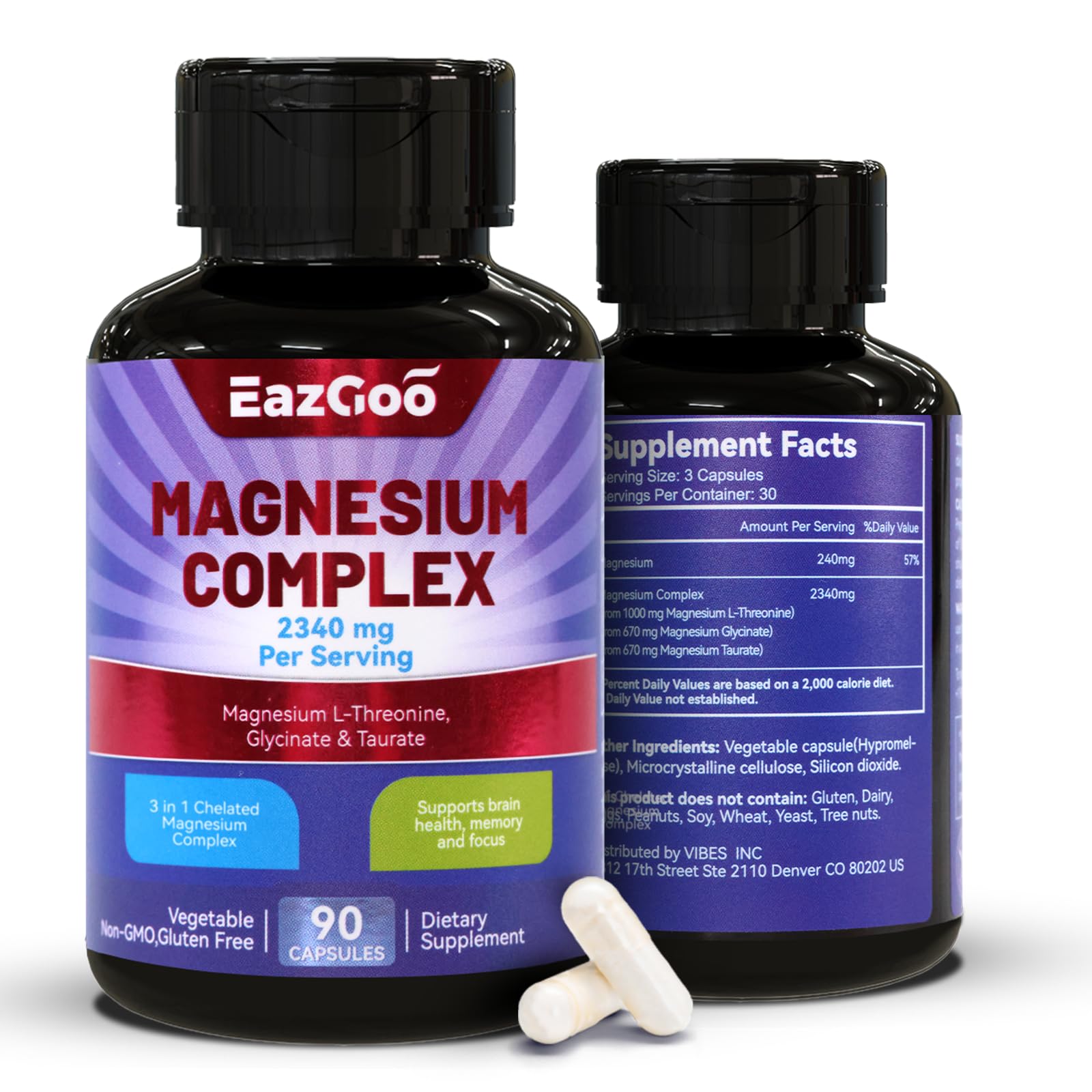 We are confident that Magnesium L Threonine Supplements are an ultra formula from high-quality sources that will meet or exceed your expectations, which is why we offer a satisfaction guarantee. EAZGOO's purpose is to provide our customers with advantageous supplements and the overall quality possible. Experience the difference for yourself. Easy to Use: Take 2 Magnesium capsules daily with water, an equivalent supply of 2340mg for the body Each purchase will have 90 capsules per bottle for 30 servings. A gluten-free, non-GMO, convenient, and suitable for vegetarians. 3-in-1 Formula for Maximum Benefits: Our high absorption magnesium triple complex is blended with l-threonine glycinate taurate in an easy-to-swallow veggie capsule for 240mg of elemental magnesium per dose. (3 capsules). To ensure optimal purity and potency, all ingredients are meticulously measured and processed for your benefit. Magnesium Complex powder 2340mg: Highly bioavailable form of Magnesium L-Threonine is a mineral chelating agent that is able to greatly enhance the bioavailability of magnesium making it highly absorbable. Magnesium Glycinate 670mg and Magnesium Taurate 670mg are an easy-swallow form of magnesium, gentle on the body. Magnesium Capsules: Increg brain magnesium values has been shown to promote relaxation, improve muscle strength, and support brain health. EAZGOO contains a unique blend of magnesium. These natural compounds in EAZGOO may supply more magnesium to the brain than other forms of magnesium.