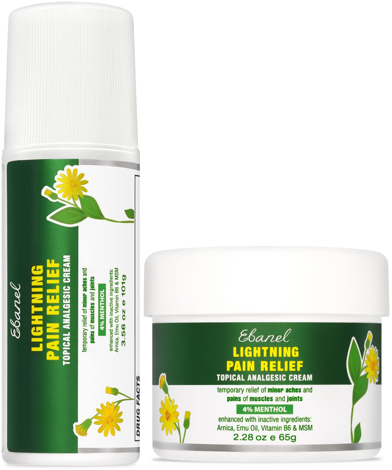 Ebanel Bundle of Pain Relief Cream Arnica Menthol 2 Oz and Pain Relief Roll On Arnica Menthol 3 Oz