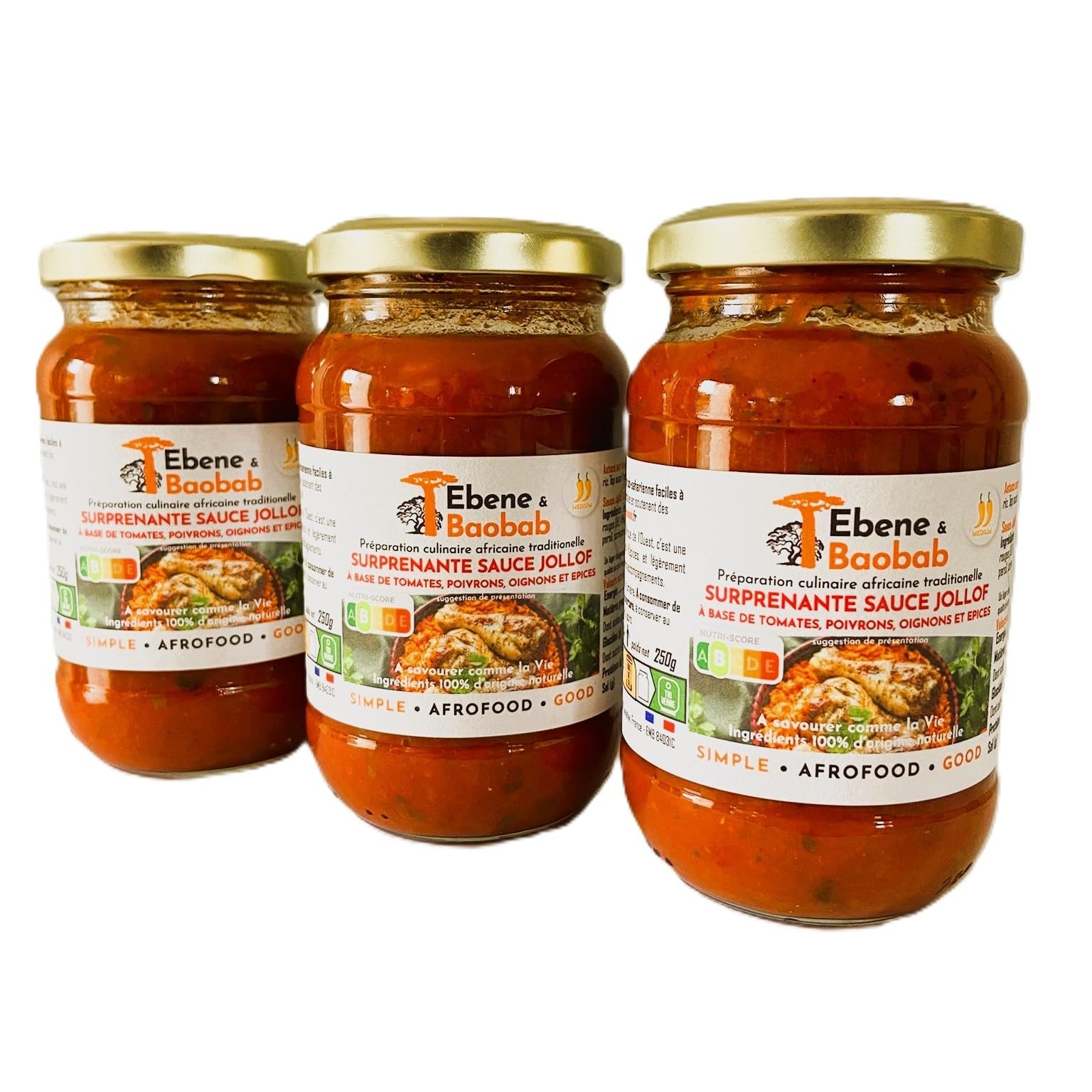 ✓Jollof sauce marinade, an icon of West Africa, is the base for the famous Jollof rice. This blend of tomatoes, vegetables, and spices offers a rich and fragrant flavor, perfect for enhancing your meats, fish, rice, or vegetables. Or even as a spread for appetizers! Lightly spiced with white pepper and paprika, it is nevertheless chili-free, allowing you to adjust the spice level to your taste. 100 natural, gluten-free, with no preservatives, added sugars, starches, or colorings, it offers a healthy experience with only 41 kcal per 100g and a Nutri-Score of B, due to the natural sweetness of the vegetables it contains. Convenient and easy to use, it allows you to recreate traditional West African dishes. ✓Ebene Baobab offers a variety of recipes on its website and social media to help you travel the world through food and add diverse African flavors to your meals. ✓Ebene Baobab is a responsible brand that has chosen to support employment in France by manufacturing its recipes with highly certified SMEs, using infinitely recyclable or reusable glass jars, and creating recipes that use minimal water for maximum flavor. E B also invests directly in agro-socio-economic development projects with women's economic interest groups (EIGs) in Africa to promote education and local employment. ?Because for us, wealth only has value if it is shared. Ebene Baobab, recipes to experience, share, and savor like life itself! ? INGREDIENTS Tomatoes (EU) 37.5 , water, onions (France) 13 , red peppers (EU) 11 , carrot, garlic, ginger (non-EU) 1 , paprika (non-EU) 1 , parsley, coriander, salt, white pepper (non-EU) 0.4 , rapeseed oil.Jollof sauce spicy Ebene Baobab - pour BBQ, pâtes, riz ou dip - de 1 à 3 personnes - Lot de 3 x bocal de 250g net - Fabriqué en France - Livraison eco-responsable en relaisDESCRIPTION DU PRODUIT DESCRIPTION DU PRODUIT ✓La sauce marinade Jollof, icône de l'Afrique de l'Ouest, est la base du célèbre riz Jollof. Ce mélange de tomates, légumes et épices offre une saveur riche et parfumée, parfaite pour rehausser vos viandes, poissons, riz ou légumes. Ou même en tartinade à l'apéritif ! Légèrement relevée grâce au poivre blanc et paprika, elle est cependant sans piment, ce qui vous permet d'ajuster l'intensité du piment à votre goût. 100 naturelle, sans gluten, sans conservateurs, ni sucres ajoutés, ni amidon ou encore colorants, elle propose une expérience saine avec seulement 41 Kcal pour 100g et un Nutriscore B, dû à la sucrosité naturelle des légumes qui la composent. Pratique, elle permet de recréer facilement des plats traditionnels de l'Afrique de l'Ouest. ✓Ebene Baobab vous propose, sur son site et les réseaux sociaux, différentes recettes pour voyager culinairement et diversifier les saveurs africaines de vos repas. ✓Ebène Baobab est une marque responsable qui a choisi de soutenir l'emploi en France en fabriquant ses recettes avec des PME hautement certifiées en qualité, en utilisant le bocal de verre recyclable à l'infini ou réutilisable chez soi et avec des recettes utilisant le minimum d'eau possible pour un maximum de goût. E B investit aussi en direct dans des projets de développement agro-socio-économique avec des GIE de femmes en Afrique, pour favoriser la scolarisation et l'emploi local. ?Car pour nous, la richesse n'a de valeur que si elle est partagée. Ebene Baobab, des recettes à vivre, à partager, et à savourer comme la vie !? INGRÉDIENTS Tomates (UE) 37,5 , eau , oignons (Fr) 13 , poivrons rouges (UE) 11 , carotte, ail, gingembre (non UE) 1 , paprika (non UE) 1 , persil, coriandre, sel, poivre blanc (non UE) 0.4 , huile de colza.