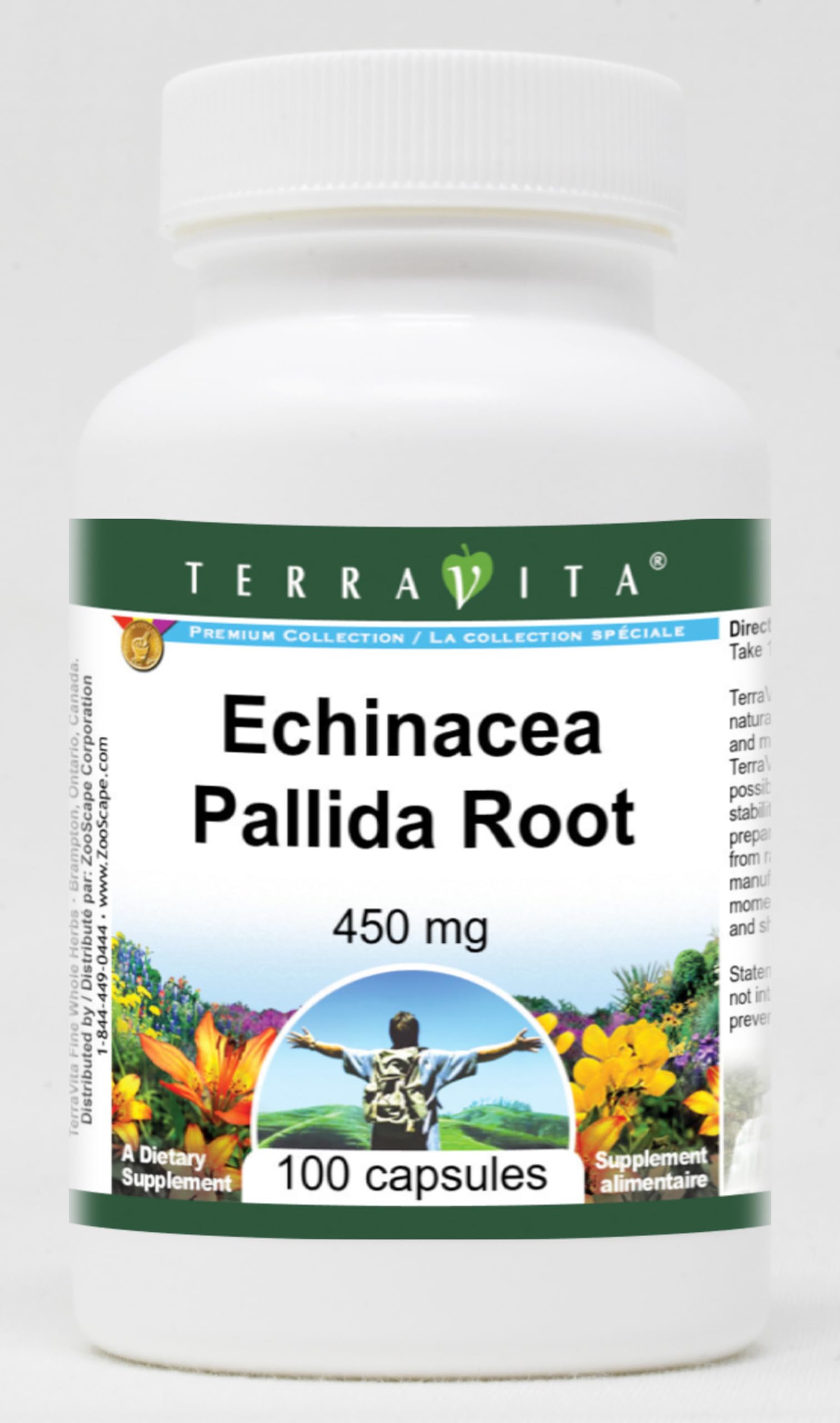 Echinacea Pallida Root - 450 mg (100 capsules, ZIN: 510908) Packaged in the United States in a GMP certified facility (Good Manufacturing Practice). No fillers. Manufacturer: TerraVita Size: 100 capsules Easy-to-swallow Capsules in a sealed bottle. Ingredients: Gelatin, Water, Echinacea Pallida Root - 450