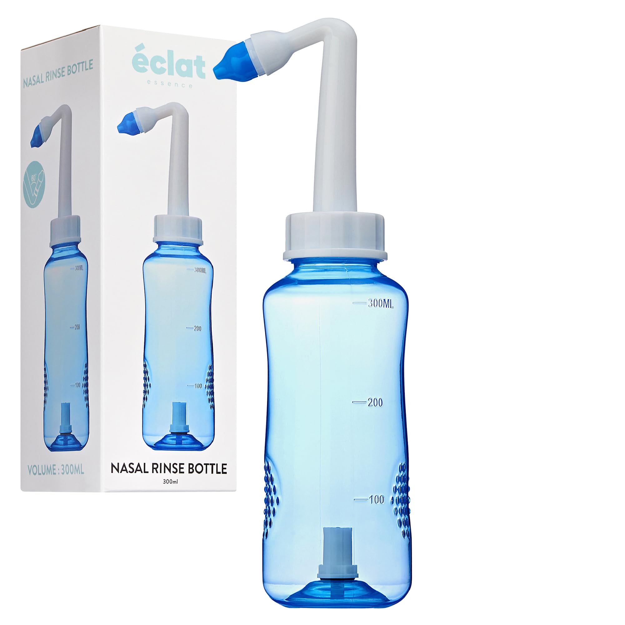 EASY-GRIP TEXTURE: Designed with a non-slip, ergonomic grip to provide steady handling for adults and kids during nasal cleaning. SAFE FOR ALL AGES: BPA-free materials and a gentle flow system make this sinus rinse bottle safe, comfortable, and family-friendly. ADJUSTABLE WATER VALVE: The precision water control valve lets you tailor pressure and flow, ensuring a safe and customized rinse experience. SMART FLOW CONTROL: Equipped with an on off smart flow button, it gives you full manual control without squeezing or straining your hands. GENTLE EFFECTIVE RELIEF: This 300mL Eclat nasal rinse bottle offers soothing, pressure-controlled irrigation for clearer, more comfortable breathing.