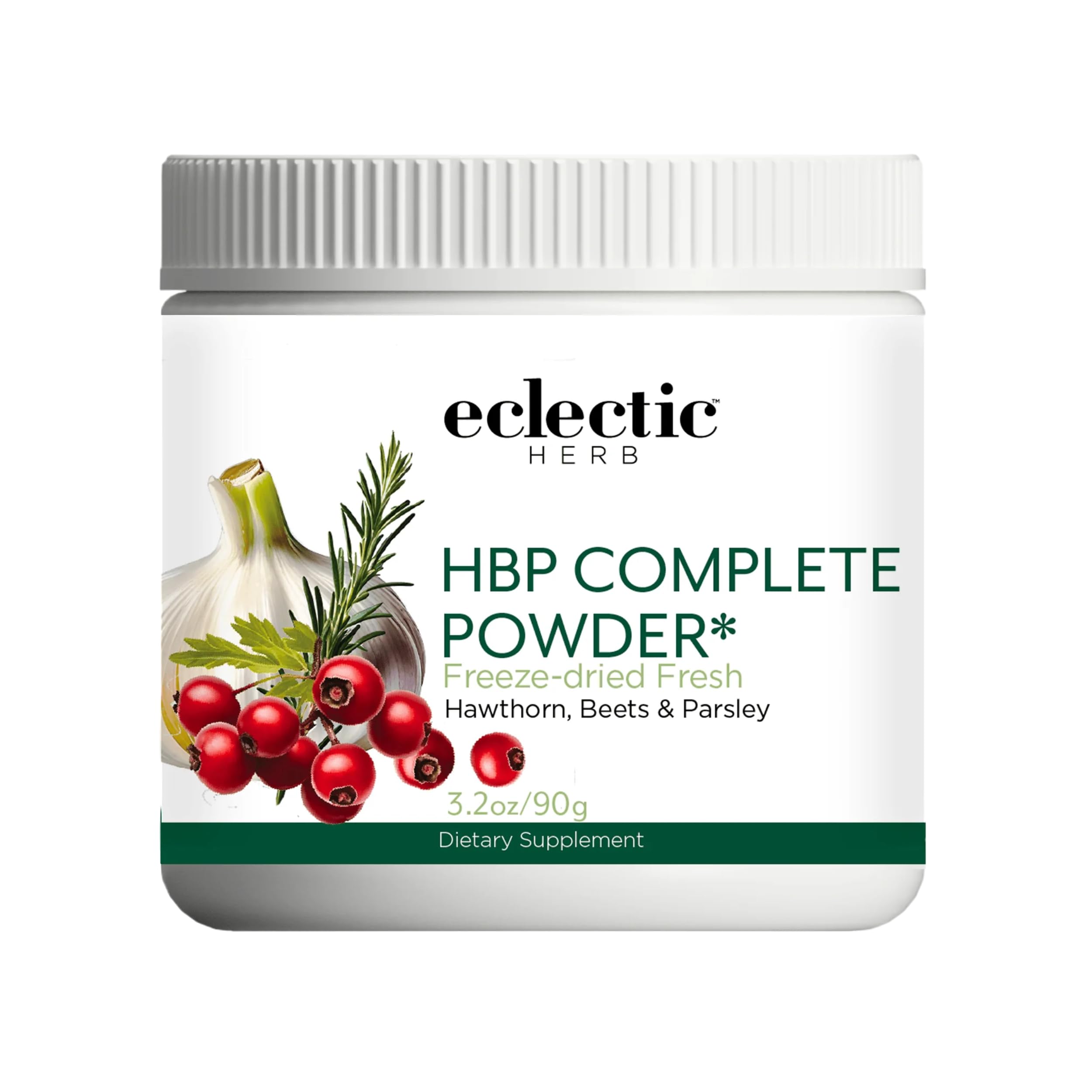 ECLECTIC HERB: Nature-inspired, freeze-dried herbal products that are good for you and the planet. Our passion for health and sustainability drives our commitment to quality. WHOLE HERB SUPPLEMENTS: Non-GMO, Gluten-Free, Soy-Free Dairy-Free. 100 pure. No artificial colors, flavors, sugar, excipients, fillers, stearates, or binders. FREEZE-DRIED FRESH: Our freeze-drying process preserves the nutrients, ensuring you get the full benefits of the fresh plants and herbs in a convenient powder form. ADD TO DRINKS: HBP Complete Powder is high in vitamins, minerals, fiber, and phytochemicals. Just add to water, drinks, or smoothies for a daily nutritional boost. HBP COMPLETE POWDER: A blend of certified organic vegetables and wildcrafted herbs harvested at peak potency and freeze-dried to support healthy blood pressure levels cardiovascular health.