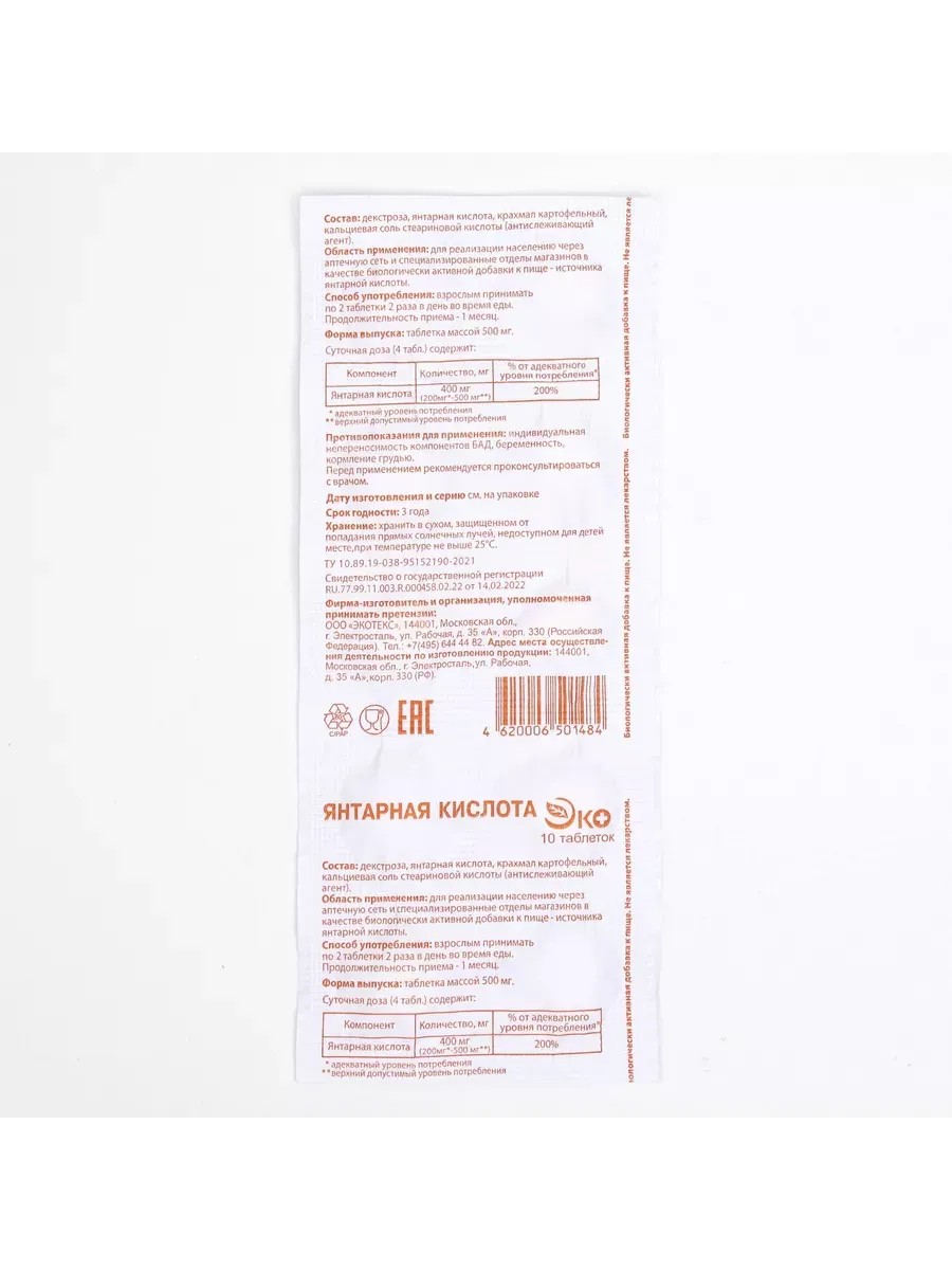 | Торговое наименование | биологически активная добавка к пище "Янтарная кислота ЭКО" (таблетки массой 500 мг) |