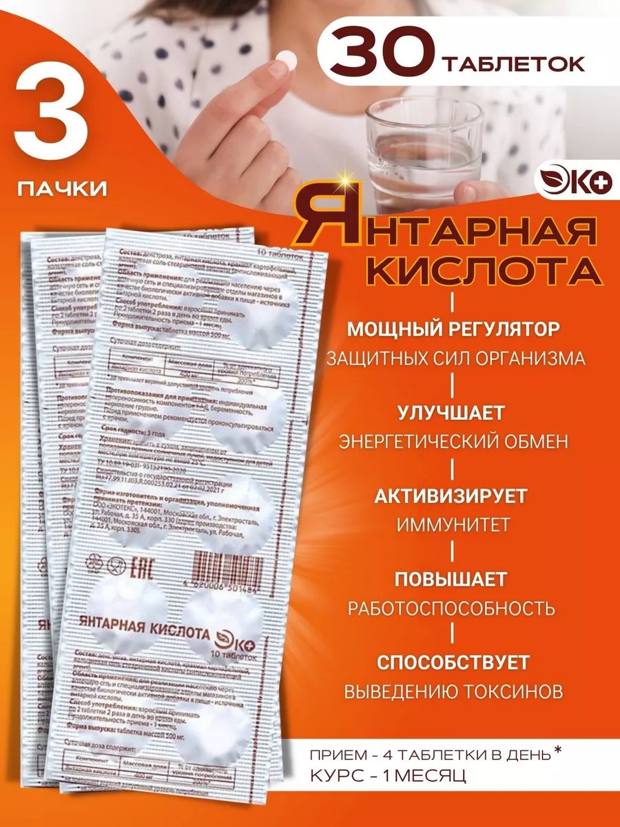 ЭКО Янтарная кислота БАД 10 таблеток 3 упаковки