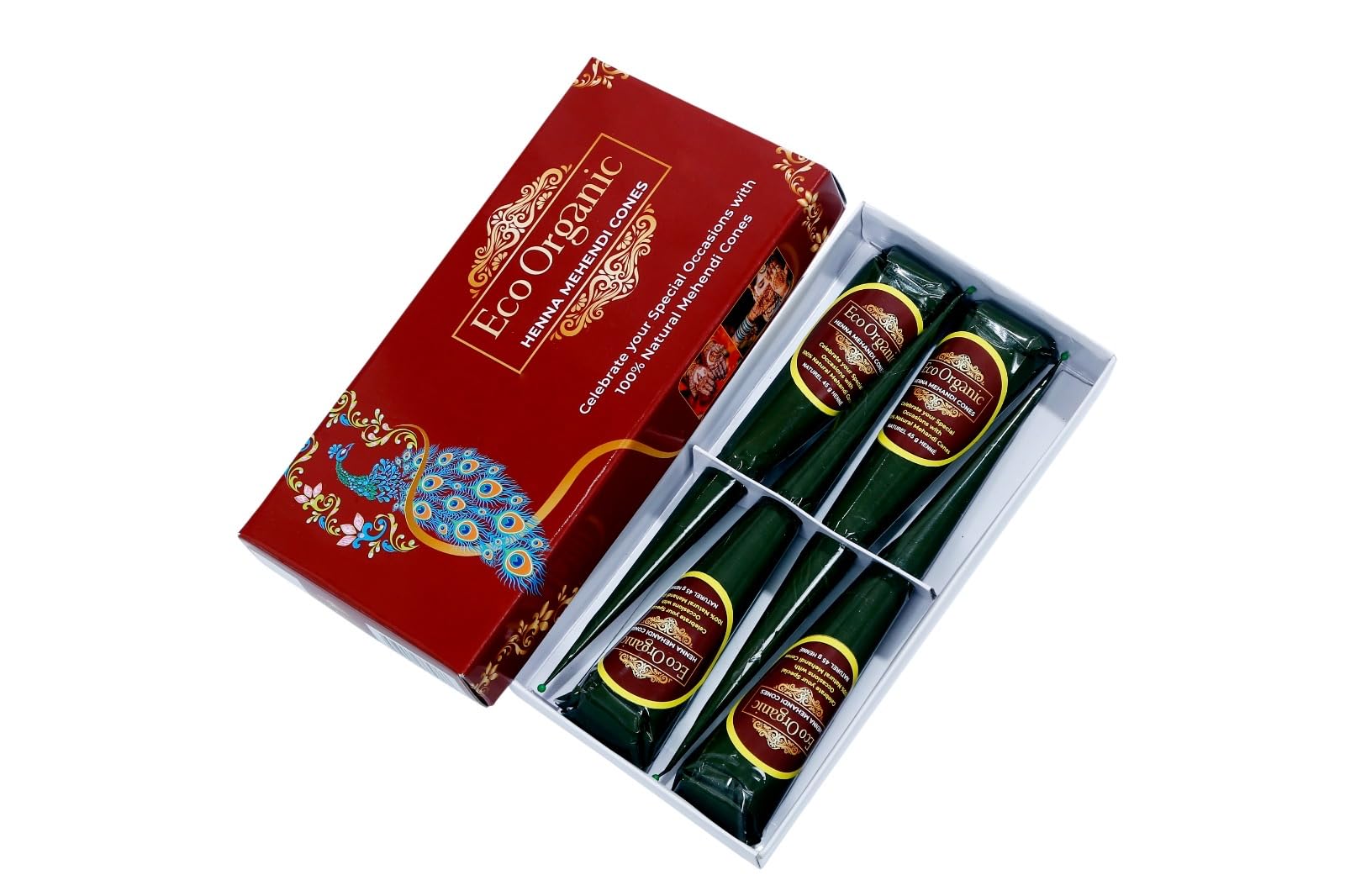Eco Organic Natural henna is sourced from henna plants grown without the use of harmful chemicals. It is considered a more natural and eco-friendly option compared to conventionally grown henna. One FREE hand Stencil with every orderVITAL REMINDER : The color may not manifest immediately due to our entirely natural paste. Allow 24-48 hours for the color to fully intensify. The longer the application remains, the deeper the hue becomes. Store in the refrigerator when not in use. PACKAGING CONTENT : Enjoy the convenience of our pack of 4 cones, each individually prepared for immediate use. With a shelf life of one year, these cones can be refrigerated to extend their longevity. USAGE : Our henna cones are perfect for adorning your arms, hands, legs, and feet. Experience a long-lasting dark maroon color that deepens over time. 100 PURE AND NATURAL :Crafted exclusively from 100 natural ingredients, our henna cones are completely free from chemical dyes. Meticulously made from the finest quality henna leaves.