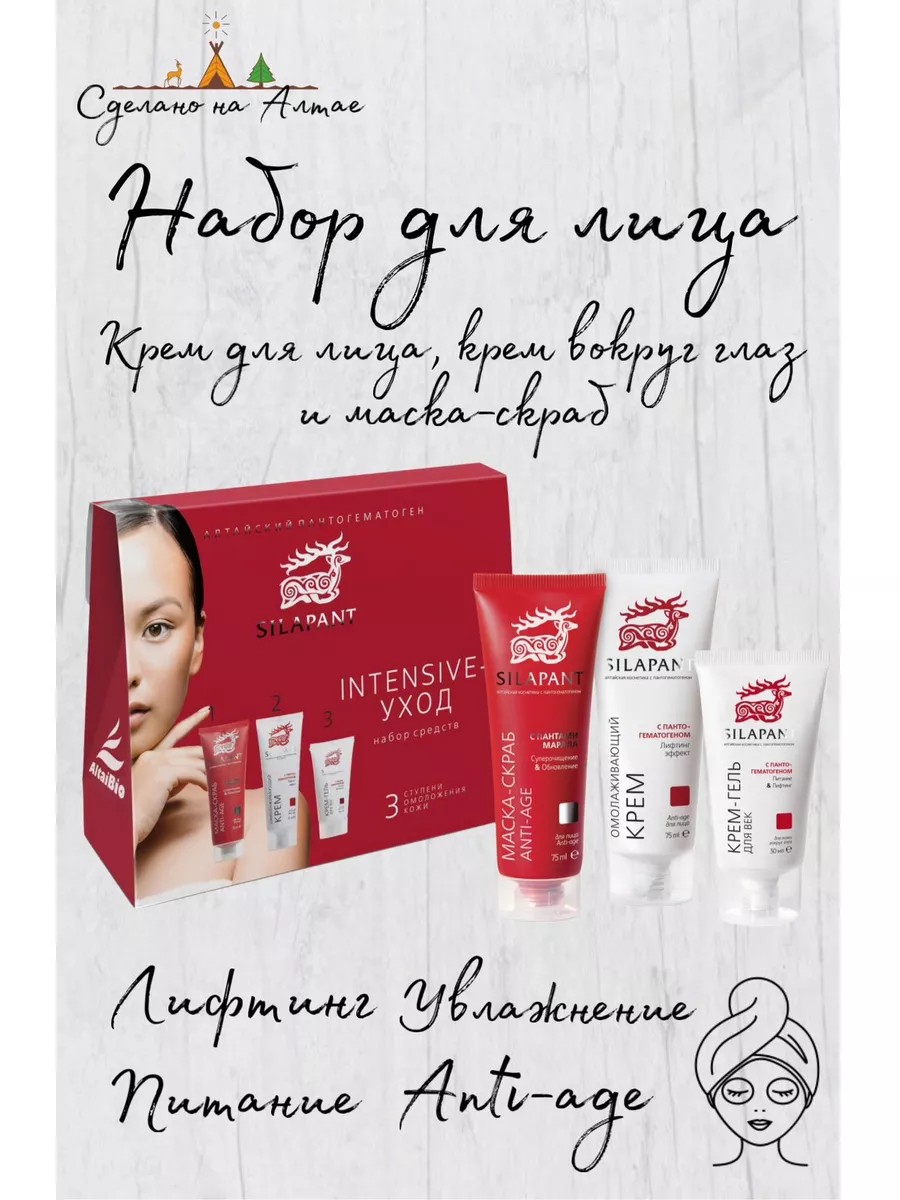 | Комплектация | Маска-скраб для лица с пантами марала, 75 мл; Крем для лица омолаживающий с лифтинг-эффектом, 75 мл; Крем-гель для кожи вокруг глаз, 30 мл |