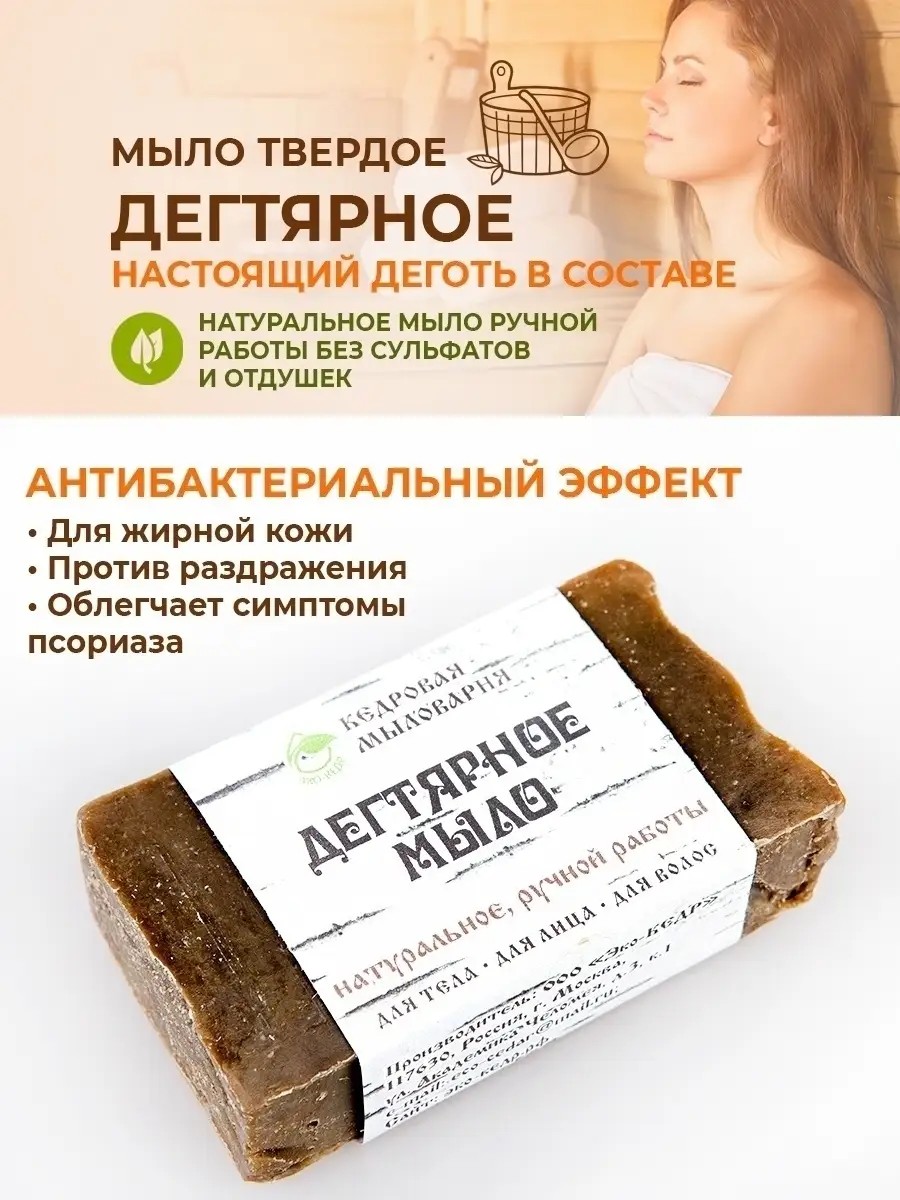 Кедровое натуральное мыло Дегтярное 10% с Живицей заменяет множество ухаживающих, косметических и лечебных средств для лица, тела и волос. Обладает антибактериальными и противовоспалительными свойствами. Брусок черного цвета, легко пенится и смывается водой. Имеет натуральный аромат дегтя. Подходит для ухода за жирной и проблемной кожи, эффективно в борьбе с акне, прыщами, псориазом и другими проблемами. Моющий состав кускового твердого мыла ручной работы очищает поры, глубоко проникая в них. Так же можно использовать как дегтярный шампунь - отличное средство для ухода за волосами и борьбе с перхотью, а также помогает как средство от выпадения волос. Мыть голову средством можно несколько раз в неделю. При применении дегтярного мыла в уходе за телом оно облегчает симптомы псориаза. Имеет безопасный и экологичный состав, благодаря этому не вызывает раздражения на коже. Не содержит в составе сульфатов, парабенов и красителей. Натуральный березовый деготь в составе оказывает антисептическое действие, бережно ухаживает за кожей, склонной к высыпаниям и сухости, шелушению и раздражению, восстанавливает ее защитные функции, увлажняет. Подходит для применения в ванной, в душе, в сауне и в бане. СПОСОБ ПРИМЕНЕНИЯ: массажными движениями нанесите на влажную кожу рук и/или тела, помассируйте и смойте теплой водой. В случае попадания в глаза промойте проточной водой. При применении в качестве шампуня - хорошо смочить волосы и кожу головы, намылить бруском руки и нанести пену круговыми движениями на корни волос, тщательно смыть водой. Подходит для ежедневного использования. Предупреждение: только для наружного применения. При обнаружении чувствительности к компонентам прекратить использование. Условия хранения: хранить при температуре от +5 ºС до +25ºС. Избегать воздействия прямых солнечных лучей. солнечных лучей.