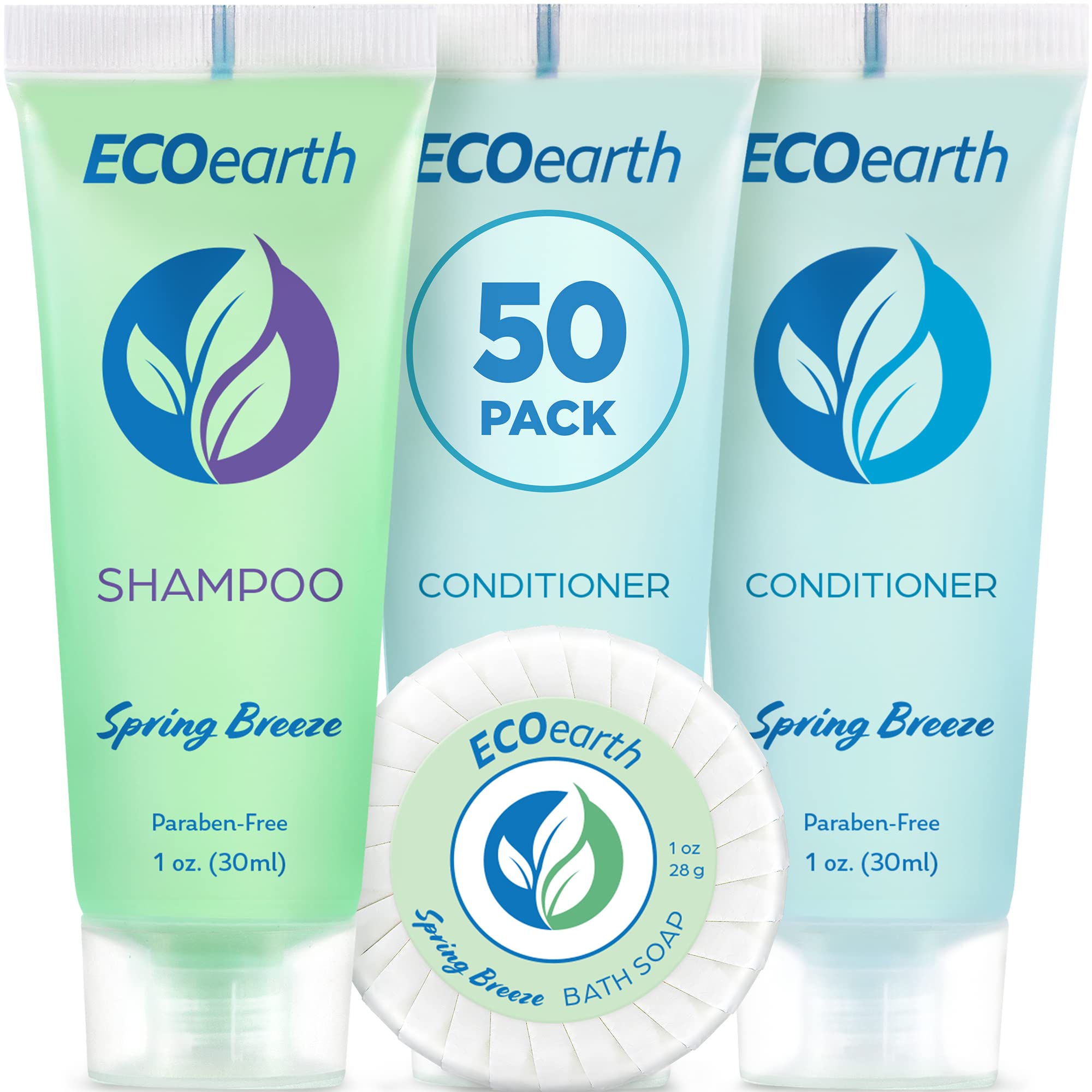PREMIUM SELECTION - We offer a variety of shower & bathing products: 2-in-1 Shampoo & Conditioner, Bar Soap, Body Wash, Conditioner, Lotion, and Shampoo. TSA-APPROVED - Our USA-designed packaging is leak-proof and safe for travel; Use this hygienic soap, shampoo & conditioner set for a clean and refreshing experience; Includes 50 soaps, 50 shampoos, and 50 conditioners. SPA-LIKE SCENT - Our proprietary Spring Breeze scent is a perfect balance of herbal & floral essences to relax, soothe & calm your senses. MAKE GUESTS HAPPY - Get luxurious bath products for your Airbnb, VRBO, Bed & Breakfast, Inn, Motel, Hotel, Gym, Cleaning Service, and more. TRUSTED INGREDIENTS - EcoEarth travel toiletries are cruelty-free, paraben-free, and have no sodium lauryl sulfates.
