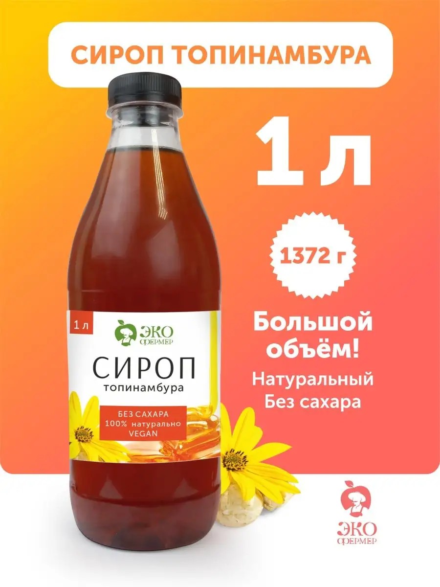 Сироп из топинамбура - органический продукт, который является натуральным заменителем сахара. Улучшает обмен веществ, выводит из организма токсины и укрепляет иммунитет. Сироп топинамбура натуральный так же является источником инулина и пектина, содержит витамины и минералы. На 100г. продукта: Калий - 110 мг, Магний - 10.4 мг, Кальций - 18.5 мг, Натрий - 1.5 мг, Витамин С - 3.1 мг, Витамин В1 - 0.01мг, Витамин В2 - 0.02 мг, Витамин РР - 1.05мг. Используется для приготовления полезных сладостей без сахара, для похудения. Подходит для диетического питания, является низкокалорийным продуктом. Можно использовать сироп для кофе, чая, молочных продуктов и других напитков, в качестве топинга для десертов без сахара. Также при приготовлении каши без сахара и другой полезной еды. Безлактозный, постный, веганский продукт без глютена. Сироп от компании Экофермер не содержит ароматизаторов и ГМО. Состав продукта: топинамбур 100%, вода.