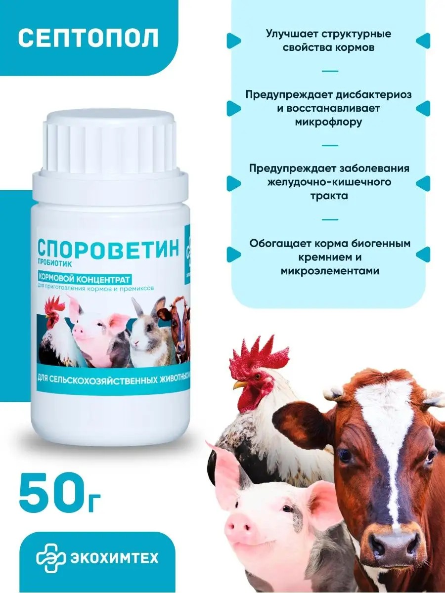 Пробиотический кормовой концентрат для приготовления кормов и премиксов применяется с целью предупреждения дисбактериозов, восстановления микрофлоры и повышения резистентности к заболеваниям. Улучшает структурные свойства кормов. Стабилизирует влажность кормов. Предупреждает заболевания желудочно-кишечного тракта. Спороветин содержит споровые бактерии Bacillus subtilis 12В не менее 1х10*6 живых микробных клеток и наполнитель. Препарат характеризуется высокой антагонистической активностью в отношении патогенных и условно-патогенных микроорганизмов, а именно: Спороветин оказывает благотворное действие не только в желудочно-кишечном тракте, но и воздействует на патологические очаги, локализованные в любом другом органе или системе организма. Доказано, что спорообразующие бактерии могут помогать не только при бактериальной и вирусной инфекции, но и при комплексном лечении больных, страдающих кишечными паразитарными заболеваниями. После попадания в желудочно-кишечный тракт пробиотические бактерии начинают продуцировать биологически-активные вещества, которые лизируют патогенные и условно-патогенные микроорганизмы. С Ферменты бактерий способны разрушать токсические вещества, а также пищевые или микробные аллергены, оказывая противовоспалительное, антитоксическое действие. Препараты из бактерий рода Bacillus, в том числе Спороветин, оказывают комплексное профилактическое действие на организм. Может использоваться ежедневно.