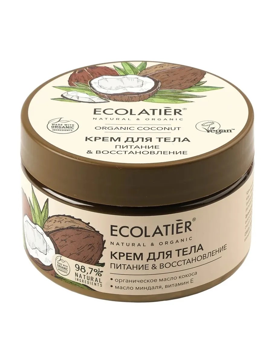 Крем для тела Ecolab "Organic Coconut", Green, Питание и восстановление, 250 мл. Крем для тела ECOLATIER ORGANIC COCONUT, благодаря ценным маслам в составе, глубоко питает кожу, повышает ее эластичность, дарит нежность и полное расслабление. Соответствует требованиям Vegan Society (Великобритания). Продукт содержит более 99% ингредиентов растительного происхождения. Органические ингредиенты: Органическое масло кокоса содержит минералы, протеины, антиоксиданты, витамины группы В (В1, В2, В3), витамин Е. Эффективно увлажняет, питает, способствует поддержанию молодости и упругости кожи. Кожа нежная и шелковистая каждый день. Состав: Aqua with infusion of: Organic Cocos Nucifera (Coconut) Liquid Endosperm (органическая Кокосовая вода); Vegetable Glycerin (растительного происхождения), Glyceryl Stearate, Cetearyl Alcohol, Organic Cocos Nucifera (Coconut) Oil (органическое масло Кокоса), Stearic Acid, Prunus Amygdalus Dulcis (Sweet Almond) Oil (масло Миндаля), Tocopheryl Acetate (витамин Е), Panthenol (Пантенол), Parfum, Potassium Sorbate, Sodium Benzoate, Benzyl Alcohol, Caprylyl Glycol, Limonene, Coumarin, Citronellol, Citral; Объем: 250; Тип кожи: Для нормальной кожи; Область использования: Тело;