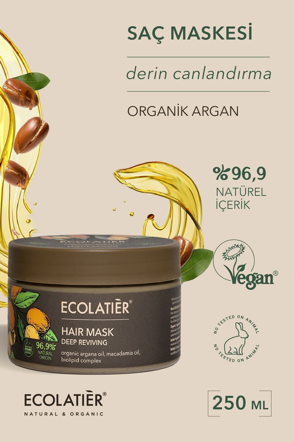 Hair Mask Deep Reviving Organic Argana Deep Revitalizing Organic Argan Hair Mask. Rich in organic plants, this product penetrates the hair structure, nourishes with microelements and vitamins, effectively repairs the hair along its entire length, and protects against brittleness. Helps to revitalize dry, dehydrated hair and add shine. It has safe, worry-free ingredients for all hair types and is vegan-friendly. INSTRUCTIONS FOR USE: Apply to wet hair. Leave on for 2-5 minutes, rinse with warm water. WARNING: For external use only. Hair Mask Deep Revitalizing Organic Argana, 250 ml • Rich in nutrients obtained from organic plants, the Organic Argana Mask penetrates the hair structure, nourishes it with microelements and vitamins, effectively repairs the hair along its entire length, protecting it from brittleness. Helps dry, dehydrated hair to revitalize and shine. Safe for all hair types, formulated with ingredients that do not cause concern and are vegan-friendly • Macadamia Oil protects the protective barrier of cells, nourishes the hair, locks in moisture and increases hair elasticity. • Biolipid Complex repairs and supports the balance of the skin's microbiota vital activity The preservation of the healthy microflora of the scalp ensures that the hair is well brushed and provides smoothness with a healthy shine. Argana Oil is cold-pressed and completely pure, untouched by any chemicals or artificial substances. Rich in unsaturated fatty acids and vitamin E, it supports hair and scalp health. Apply to wet hair. Leave on for 2-5 minutes, rinse with warm water. For external use only Ingredients Water, Cetearyl Alcohol, Glycerin, Butyrospermum Parkii Butter, Behentrimonium Chloride, Argania Spinosa Kernel Oil , Bertholletia Excelsa Seed Oil, Prunus Amygdalus Dulcis Oil, Macadamia Integrifolia Seed Oil, Hydrolyzed Vegetable Protein, Phospholipids, Glycine Soybean Oil, Glycolipids, Glycine Soy Sterols, Magnesium Aspartate, Zinc Gluconate, Copper Gluconate, Citric Acid, Benzyl Alcohol, Potassium Sorbate, Sodium Benzoate, Perfume - ingredients from organic farming