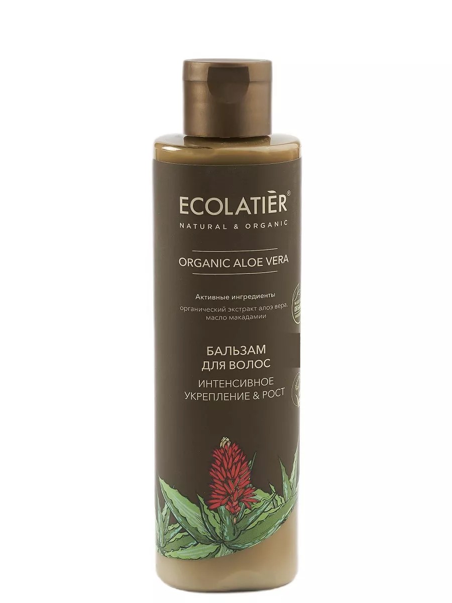 ECOLATIER Organic Aloe Vera Conditioner nourishes and moisturizes hair, restores vitality, and makes it manageable and elastic. Conforms to the requirements of the Vegan Society (UK). Organic ingredients: organic aloe vera extract contains essential oils, enzymes, vitamins, amino acids, minerals, polysaccharides, and phytoncides. It is highly bioavailable and acts as a natural stimulator of cell and tissue regeneration, providing deep hydration and soothing skin, leaving it soft, supple, and nourished. Effectively strengthens hair and has a beneficial effect on the scalp. Active ingredients: macadamia oil softens hair, enriching it with trace elements and vitamins. Apply a small amount of conditioner to damp hair for 1-2 minutes, then rinse with water. For external use only.