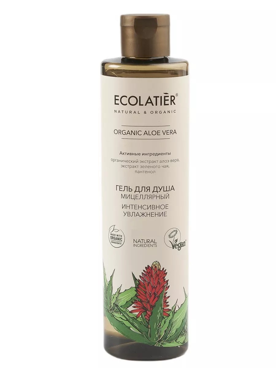 ECOLATIER Organic Aloe Intensive Moisturizing Micellar Shower Gel, thanks to micelles and active ingredients, gently cleanses the skin, tones it, and saturates it with moisture and nutrients. Regular use of the gel leaves the skin more elastic, velvety, and hydrated. Meets the requirements of the Vegan Society (UK). Organic ingredients: organic aloe vera extract contains vitamins, amino acids, minerals, polysaccharides, and phytoncides.